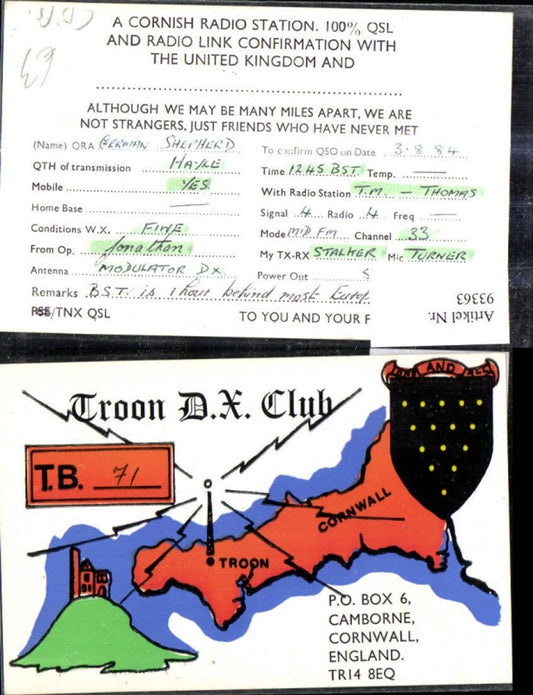 93363,QSL CB Karte Camborne Cornwall England Troon DX Club TB 71