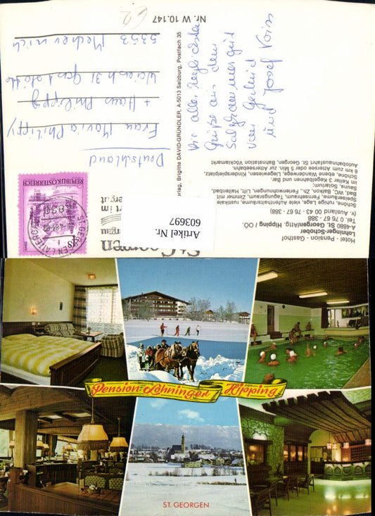 603697,Mehrbild Ak St Georgen i. Attergau Pension Lohninger Hipping Schwimmbad Pferdeschlitten