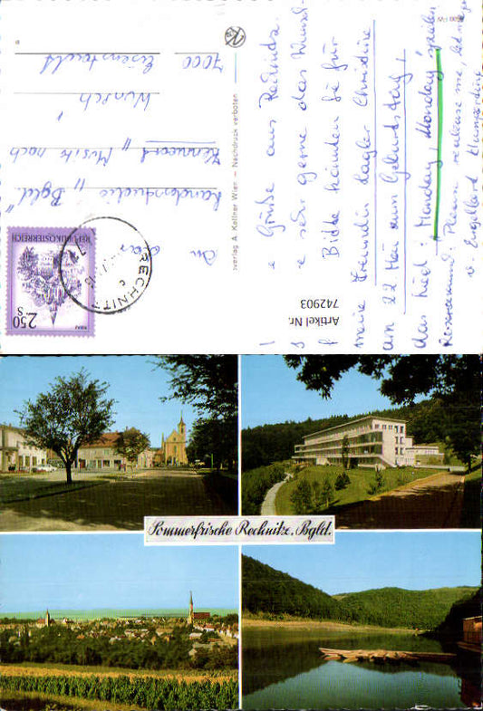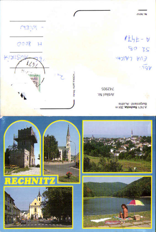 742905 Mehrbild AK Rechnitz Badeufer Badesee Kirche Ansicht Turm