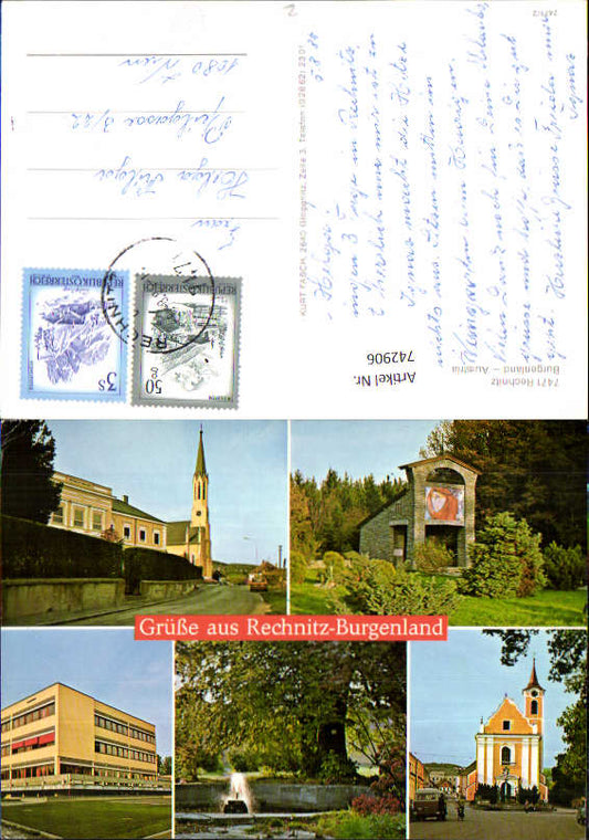 742906 Mehrbild AK Rechnitz Kirche Springbrunnen Schule