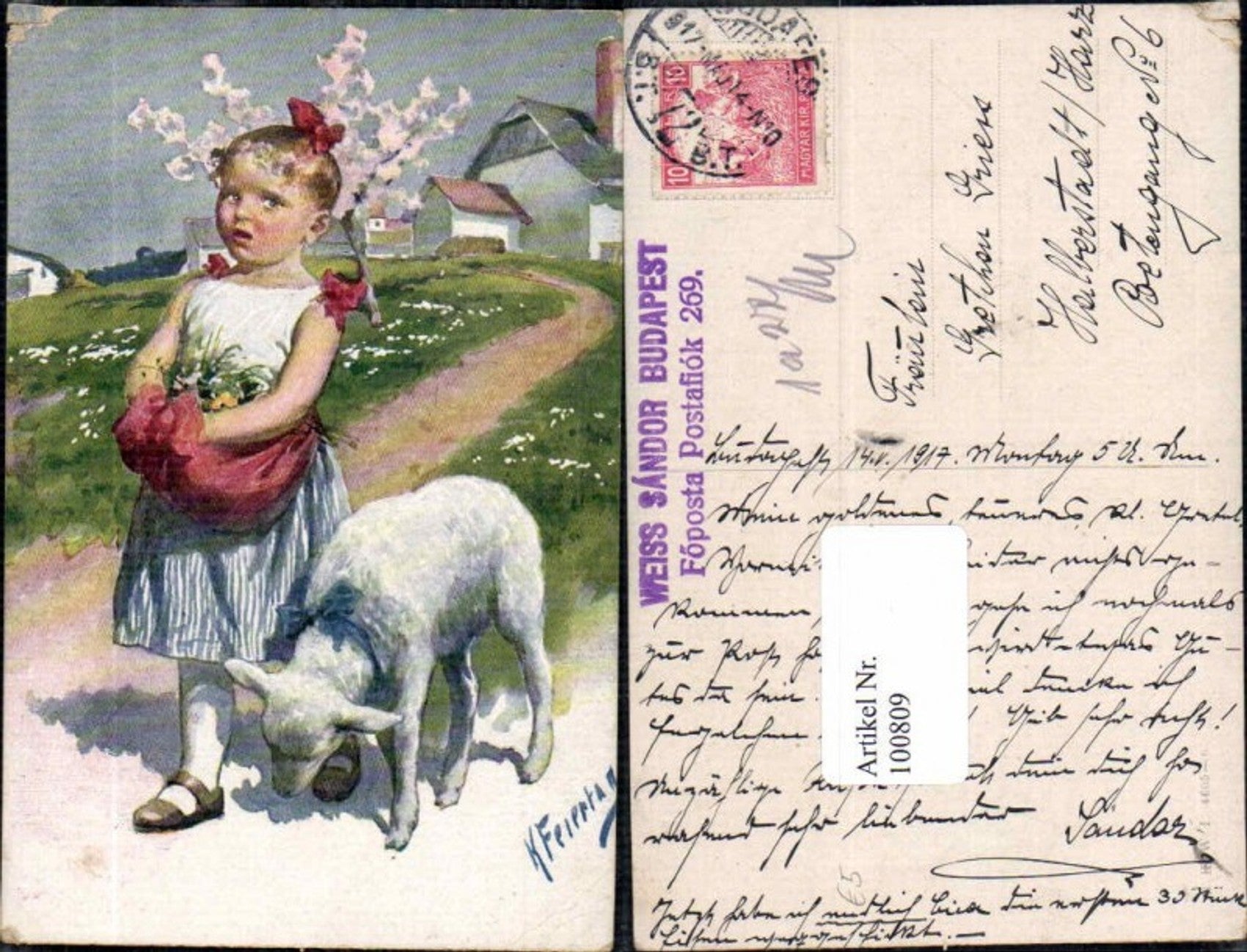 100809,Karl Feiertag Schaf m. Kind Blumen sign. B.K.W.I 4605-6