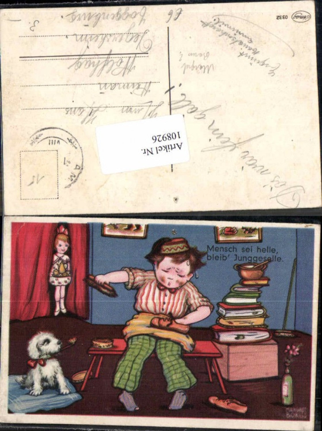108926,Margret Borus sign. Hund m. Junge Juxkarte Schuh putzen