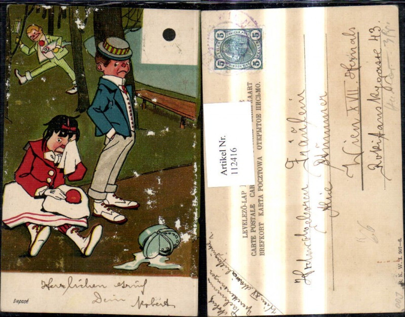 112416,Künstler Ak Scherz Humor Frau weint Korb liegt a. Boden