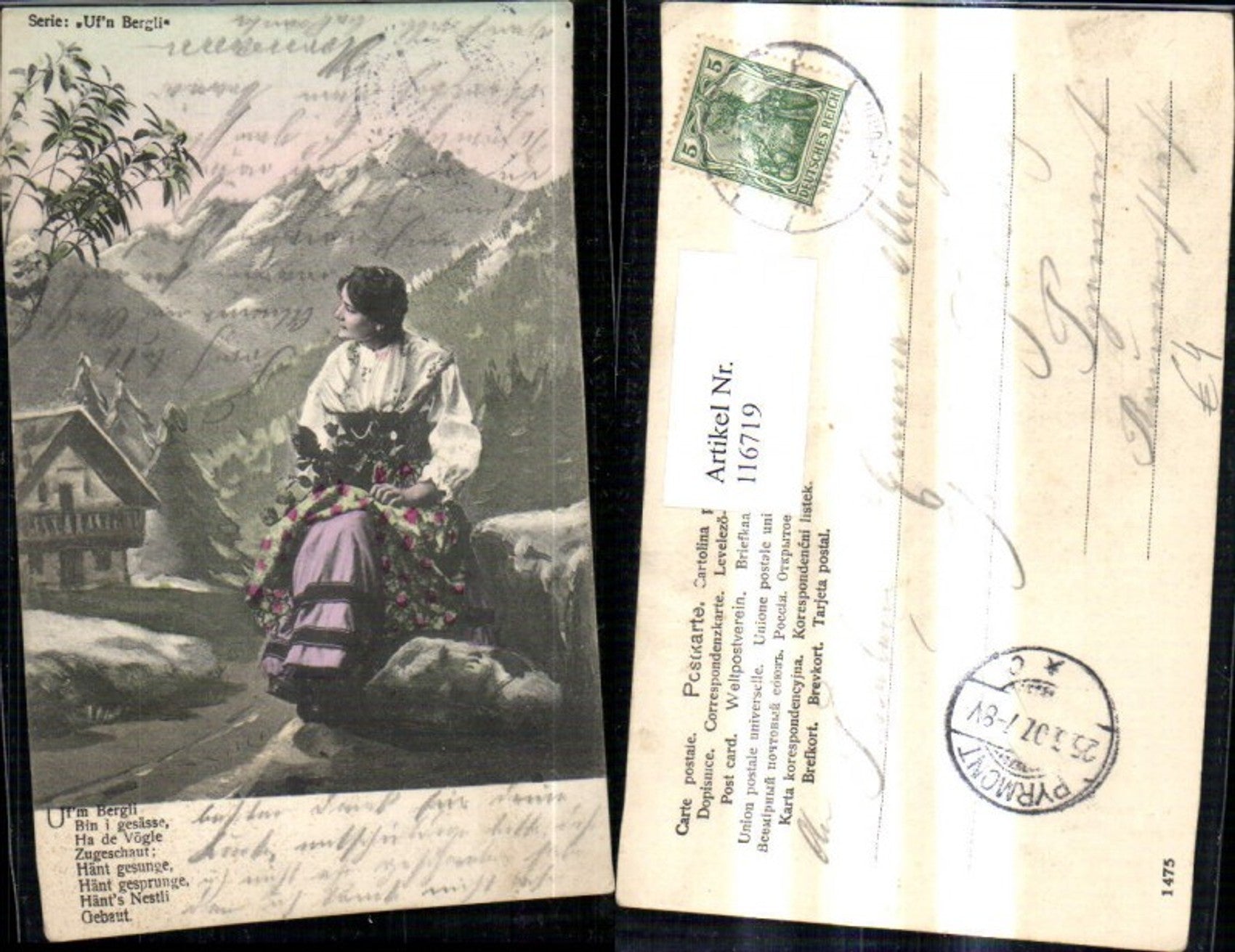 116719,Künstler Ak Ufn Bergli Frau Tracht v. Bergkulisse Spruch Text