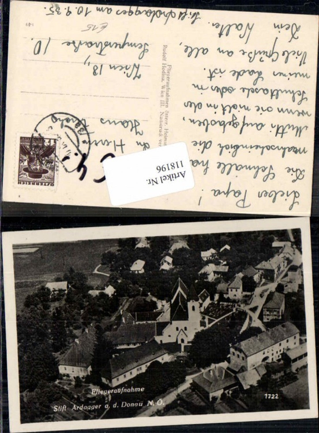 118196,seltene Fliegeraufnahme Stift Ardagger bei Amstetten 1938 Hodina AK 1722