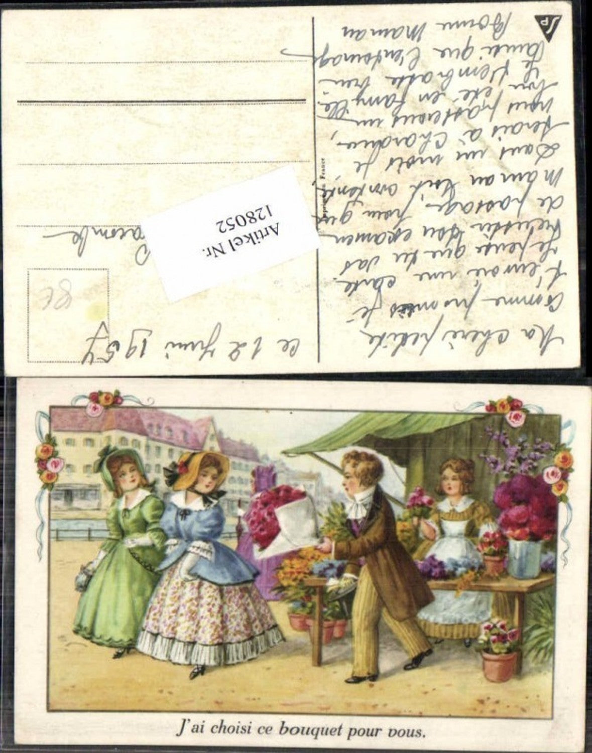 128052,Süsse Mädchen m. Kleider Marktstand Junge bringt Blumen Rosen