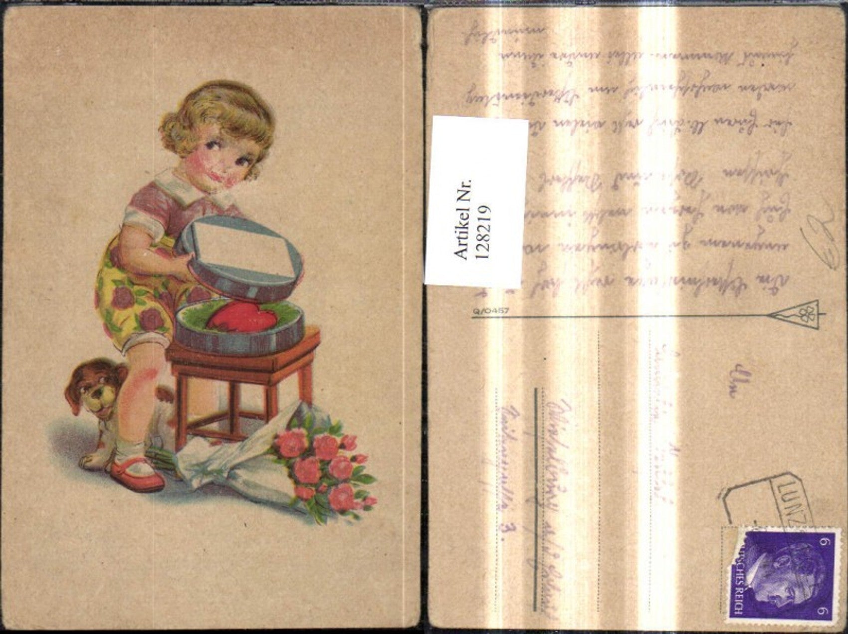 128219,Künstler Ak Mädchen m. Geschenkschachtel Herz Hund Rosen Strauß Blumen