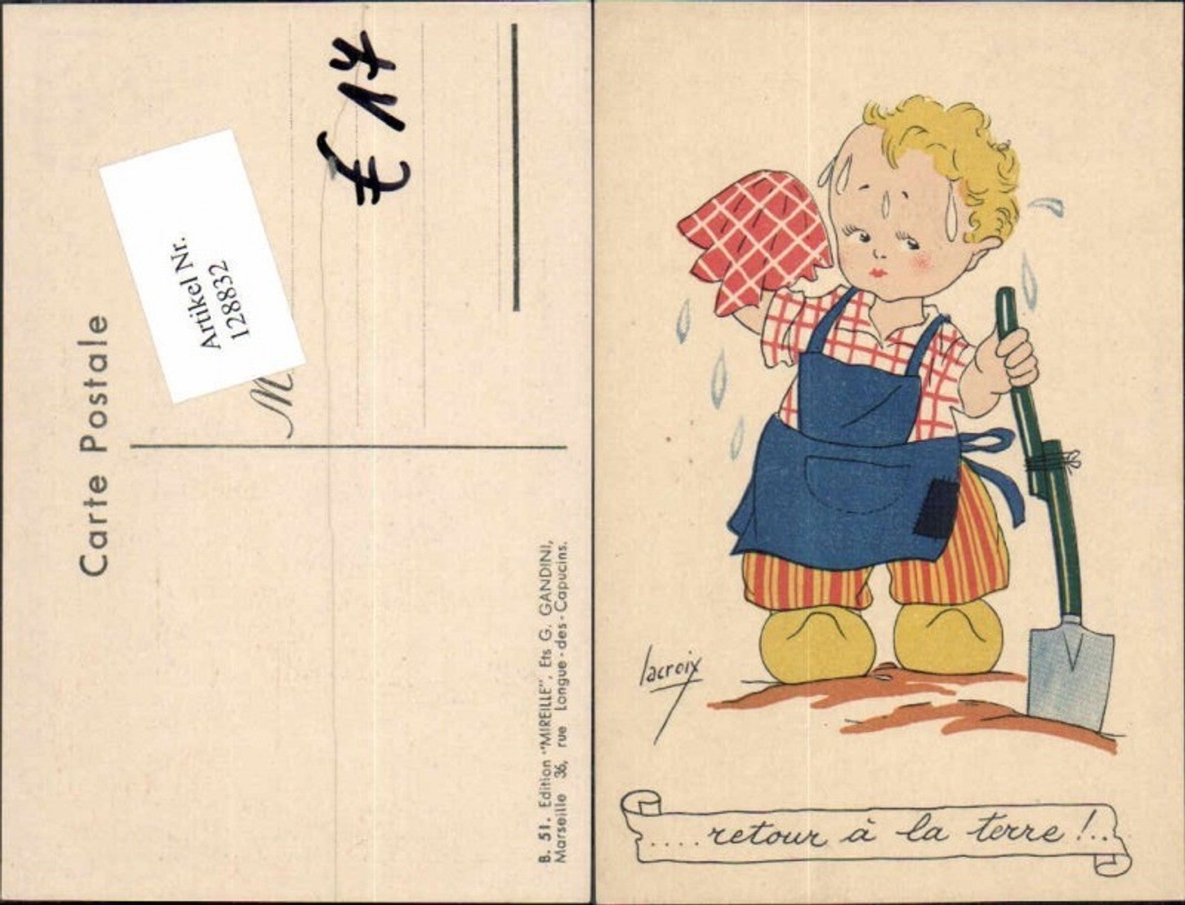 128832,Lacroix Kind als Gärtner Beruf schwitzt Schaufel Spaten