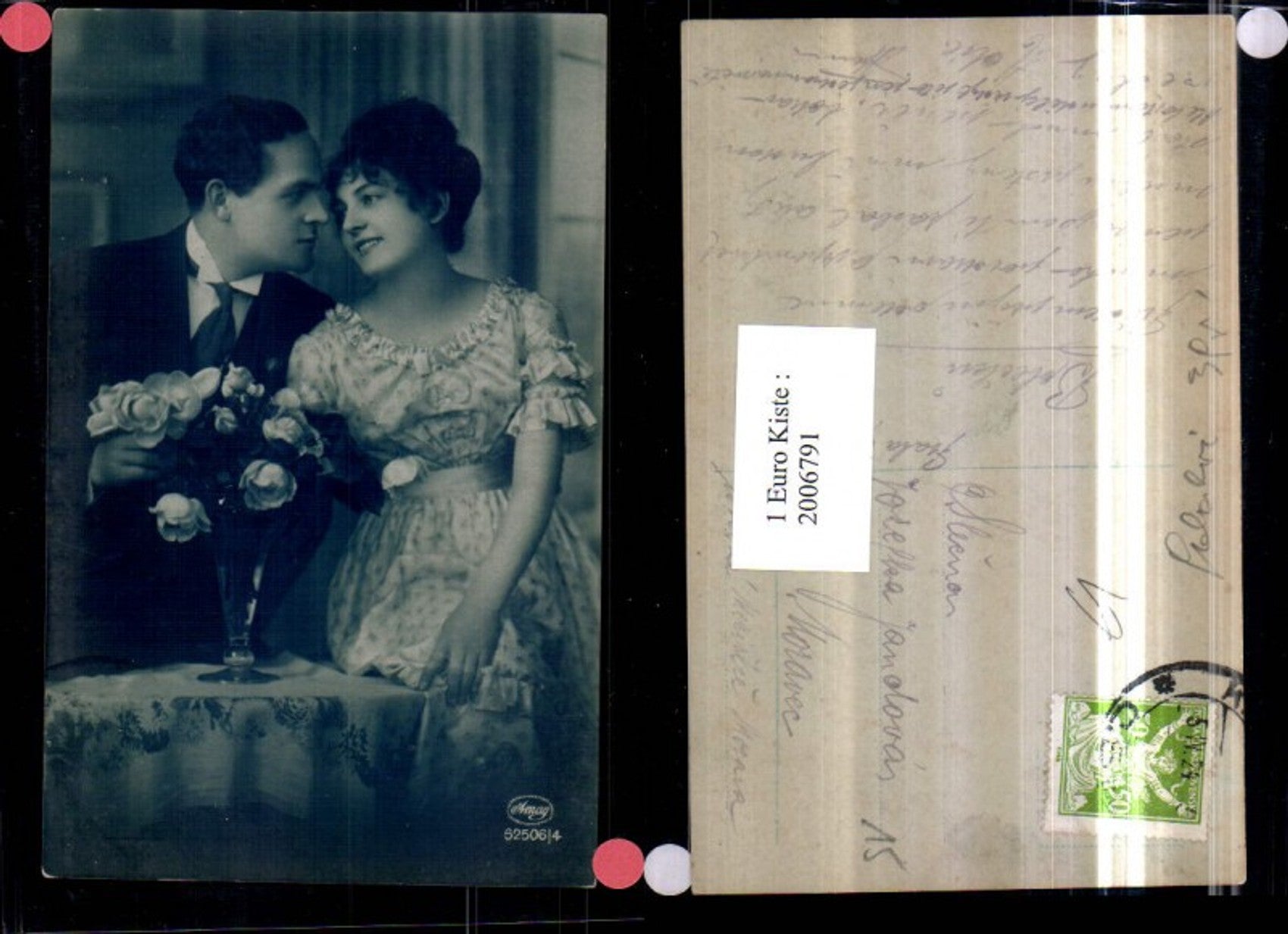 2006791,Liebe Liebespaar Frau m. Kleid Mann m. Anzug Rosenstrauß Vase