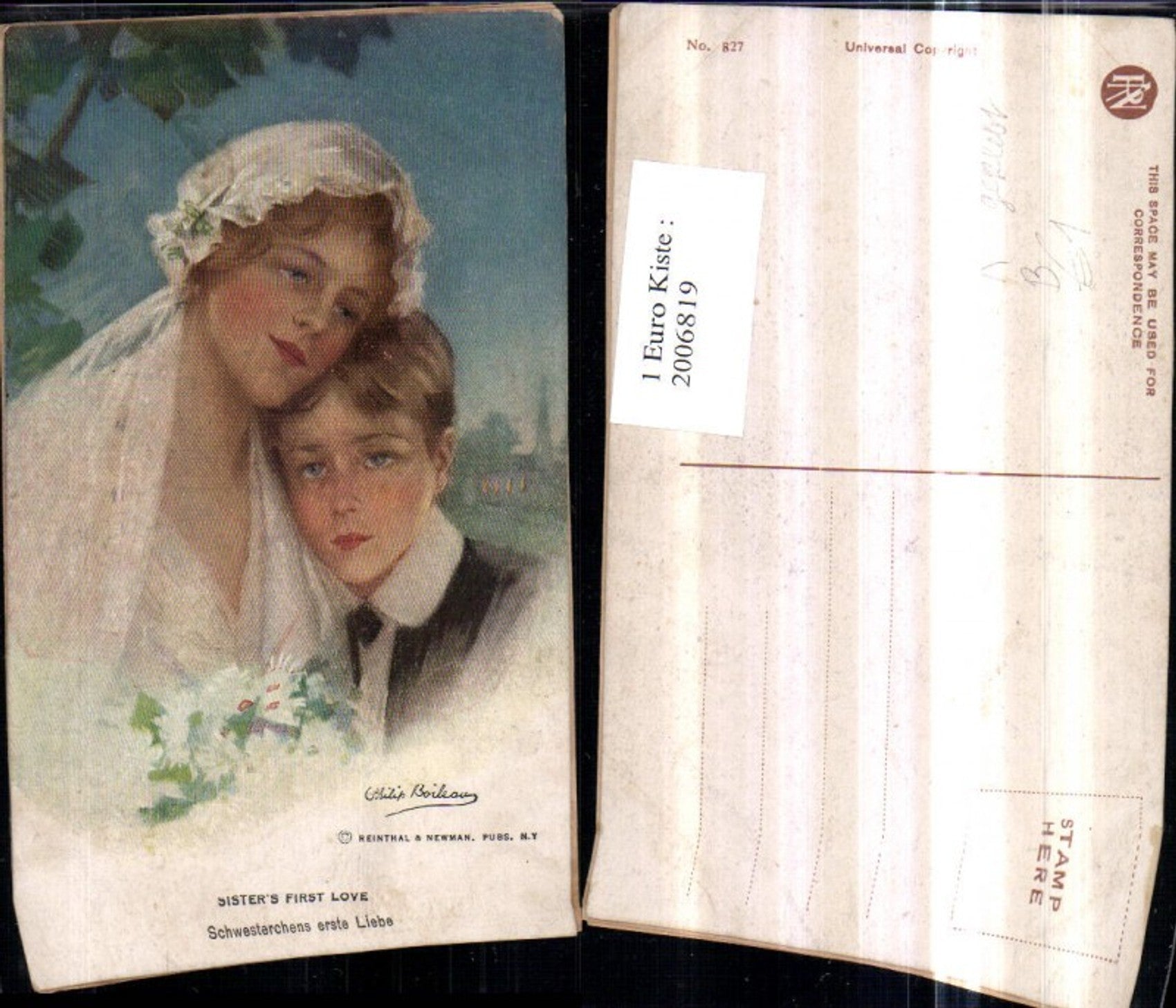 2006819,Künstler AK Philip Boileau Schwesterchens erste Liebe Junge Mädchen m. Schleier Blumenstrauß Portrait