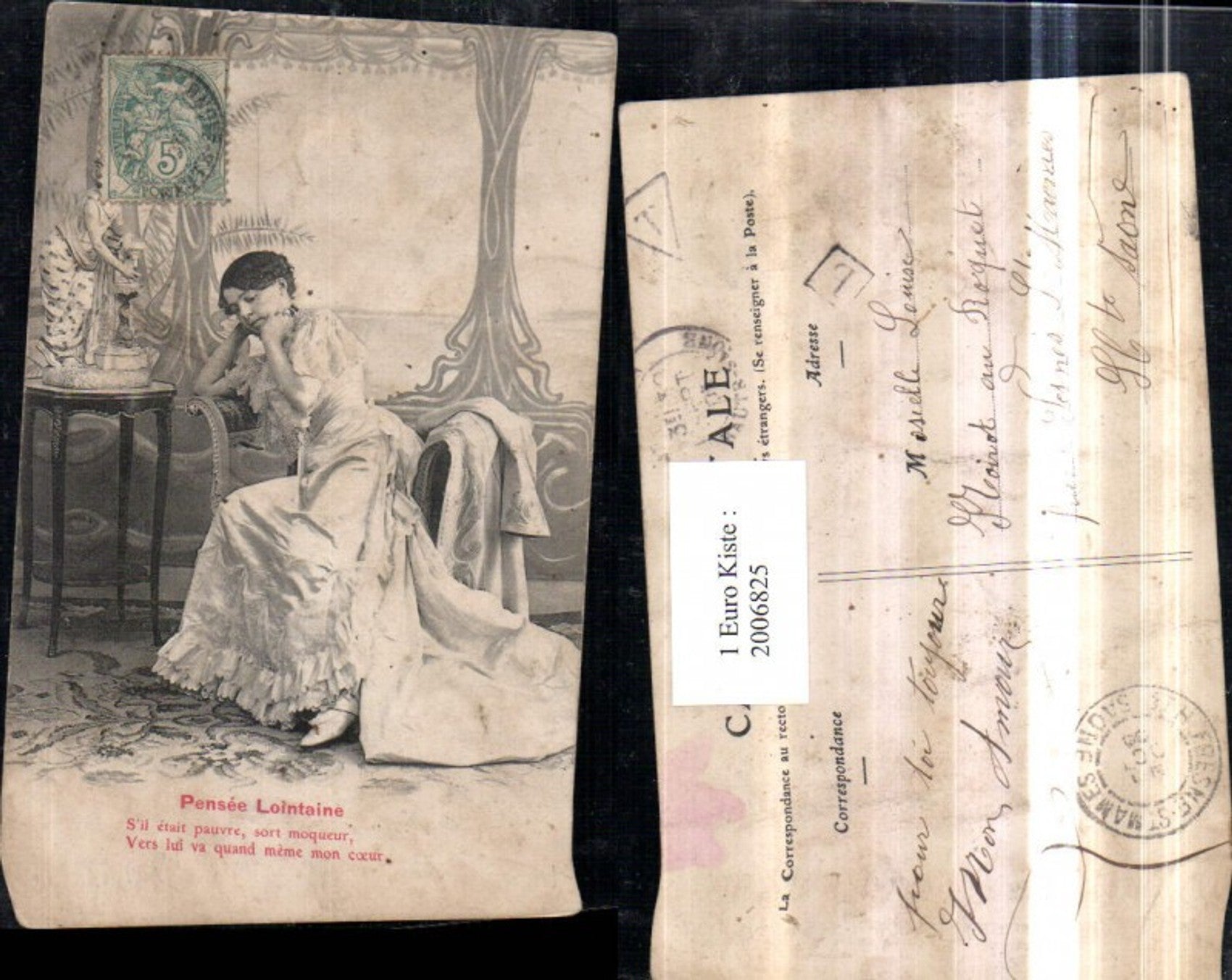 2006825,Pensee Lointaine Spruch Text Frau m. Kleid Sehnsucht Stuhl Sessel Tischchen