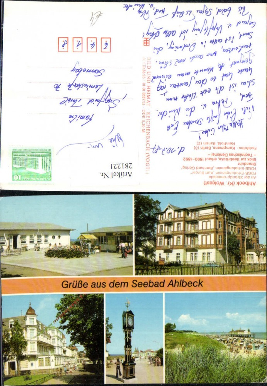 281221,Seebad Ahlbeck Strandpromenade FDGB-Erholungsheime Stranduhr Strand Seebrücke Mehrbildkarte