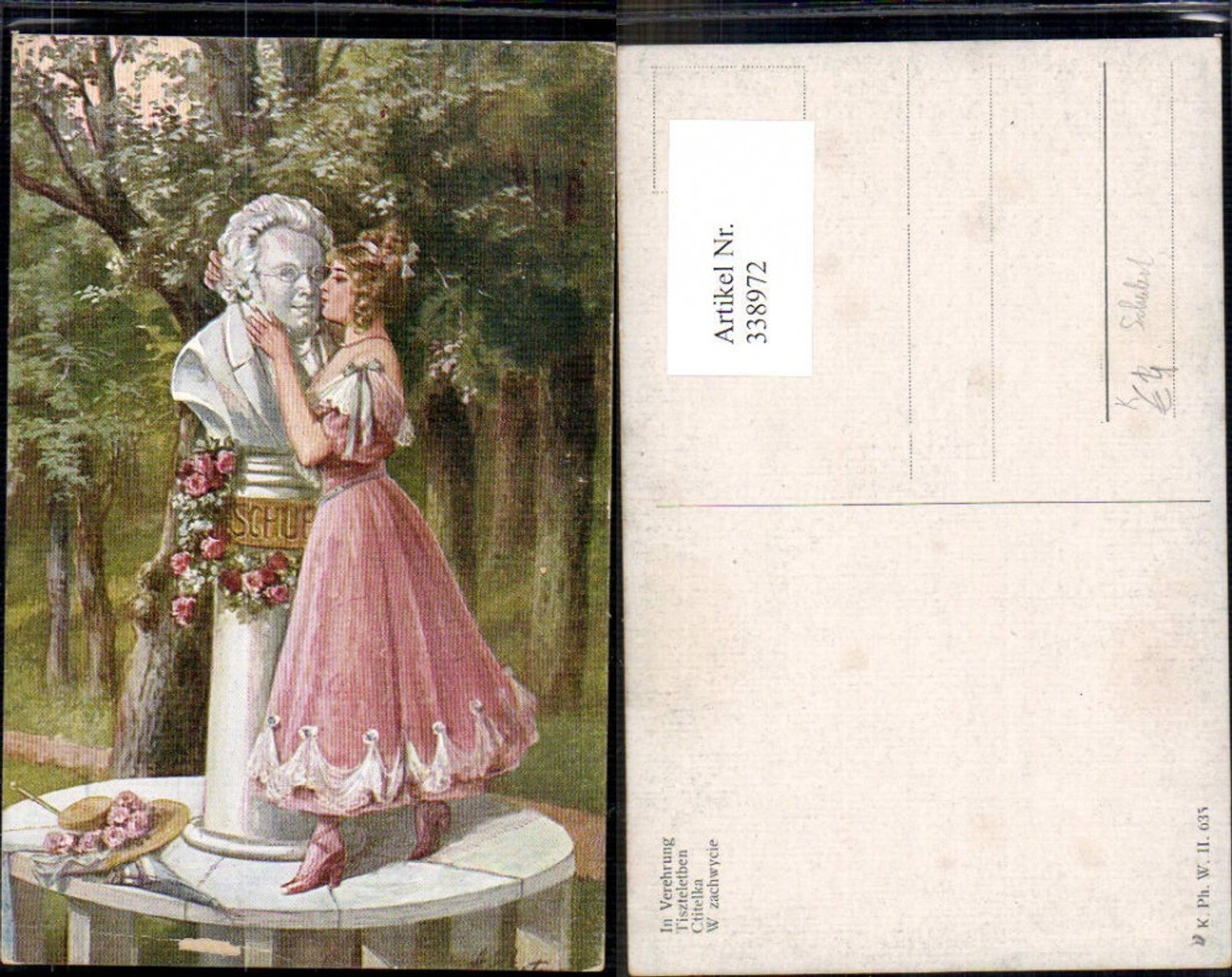338972,Künstler Ak In Verzehrung Frau küsst Schubert Denkmal Statue Komponist Musik
