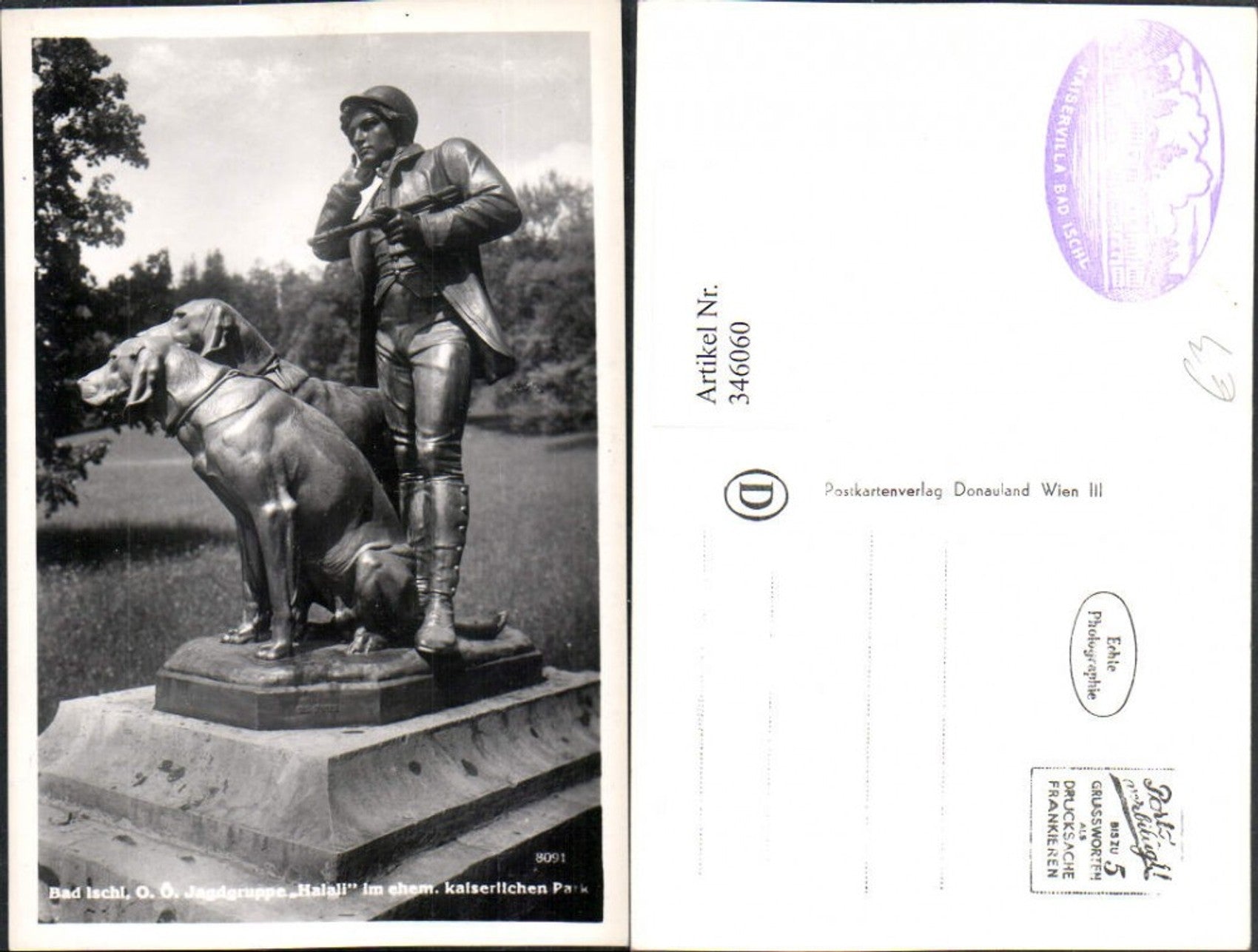 346060,Bad Ischl Jagdgruppe Halali im kaiserlichen Park Statue Hunde