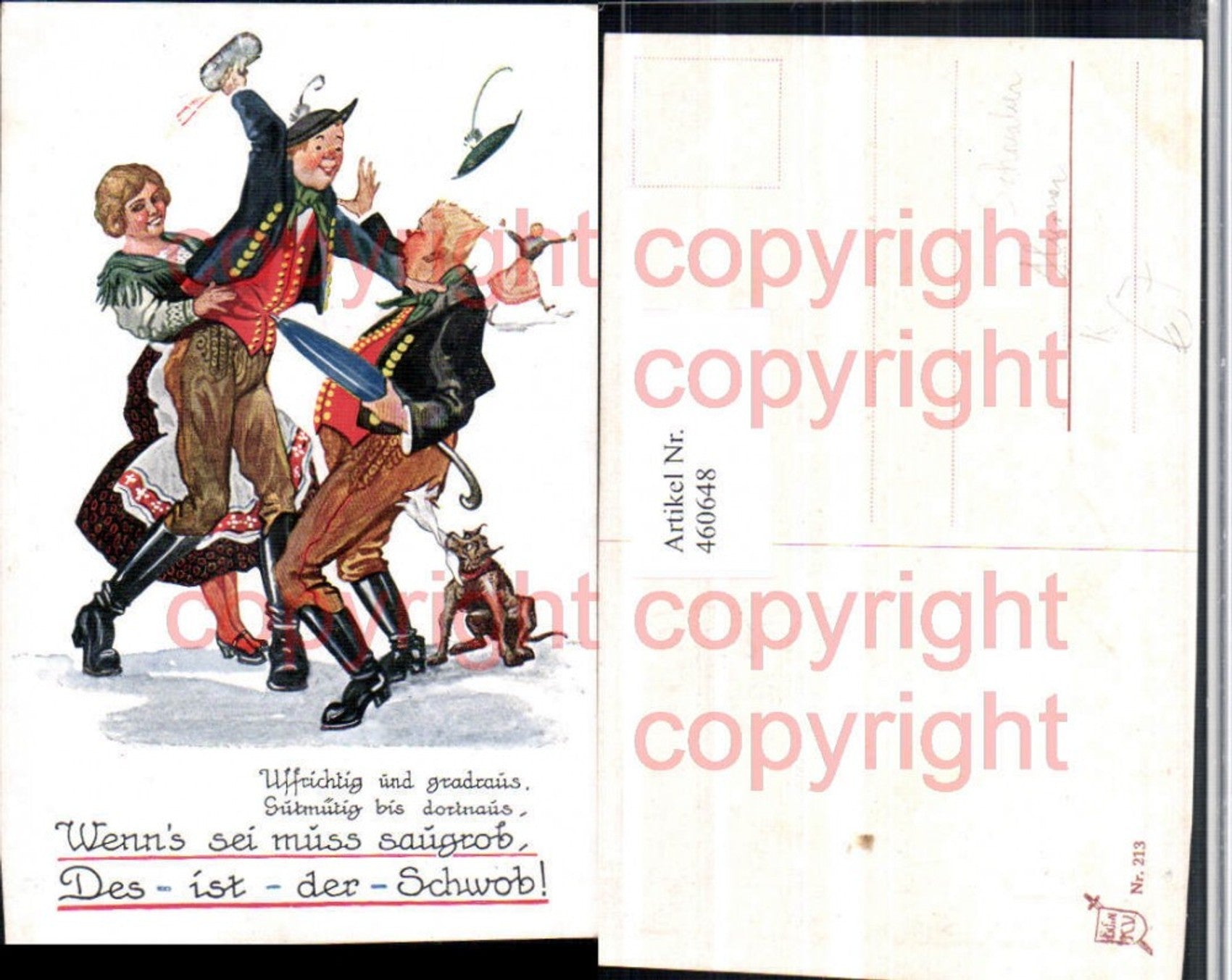460648,Künstler AK Männer Schwaben Kampf Schirm Hund Humor