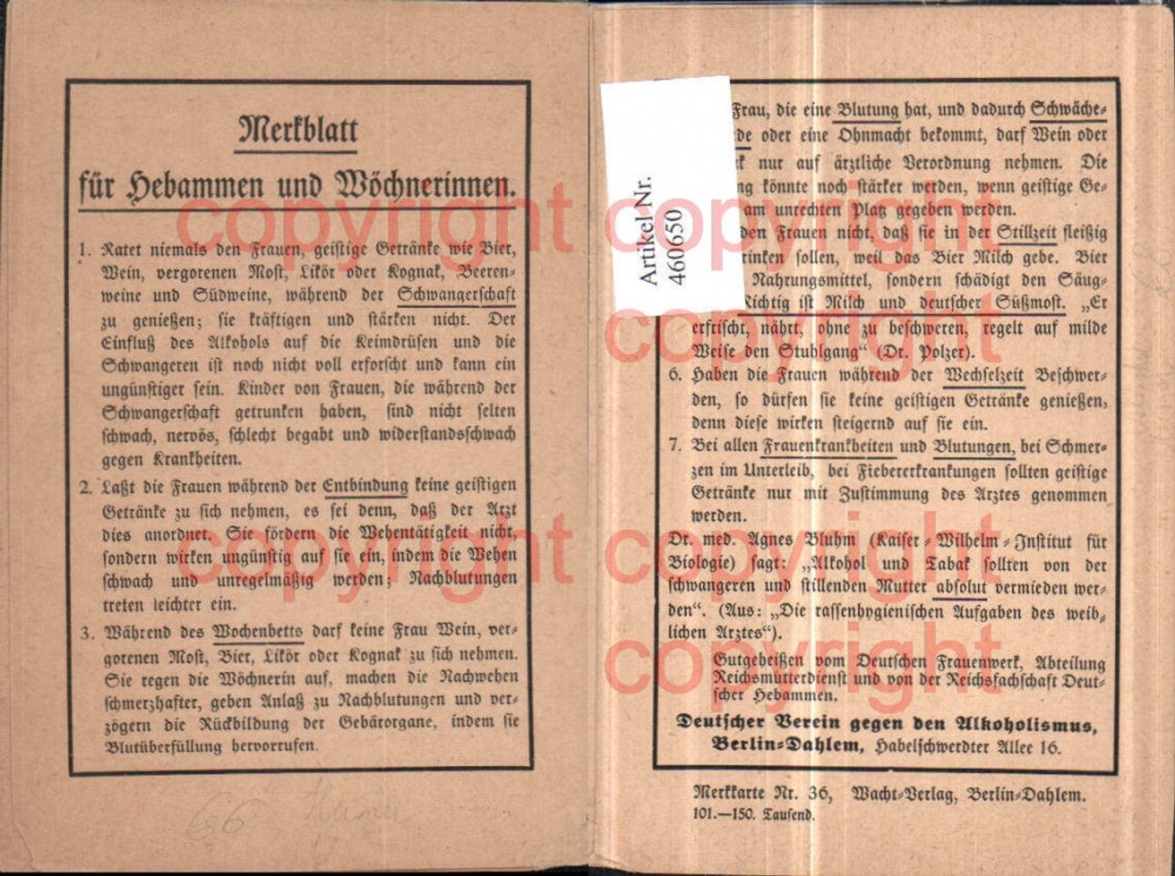 460650,Merkblatt für Hebammen u. Wöchnerinnen Text Alkohol Humor