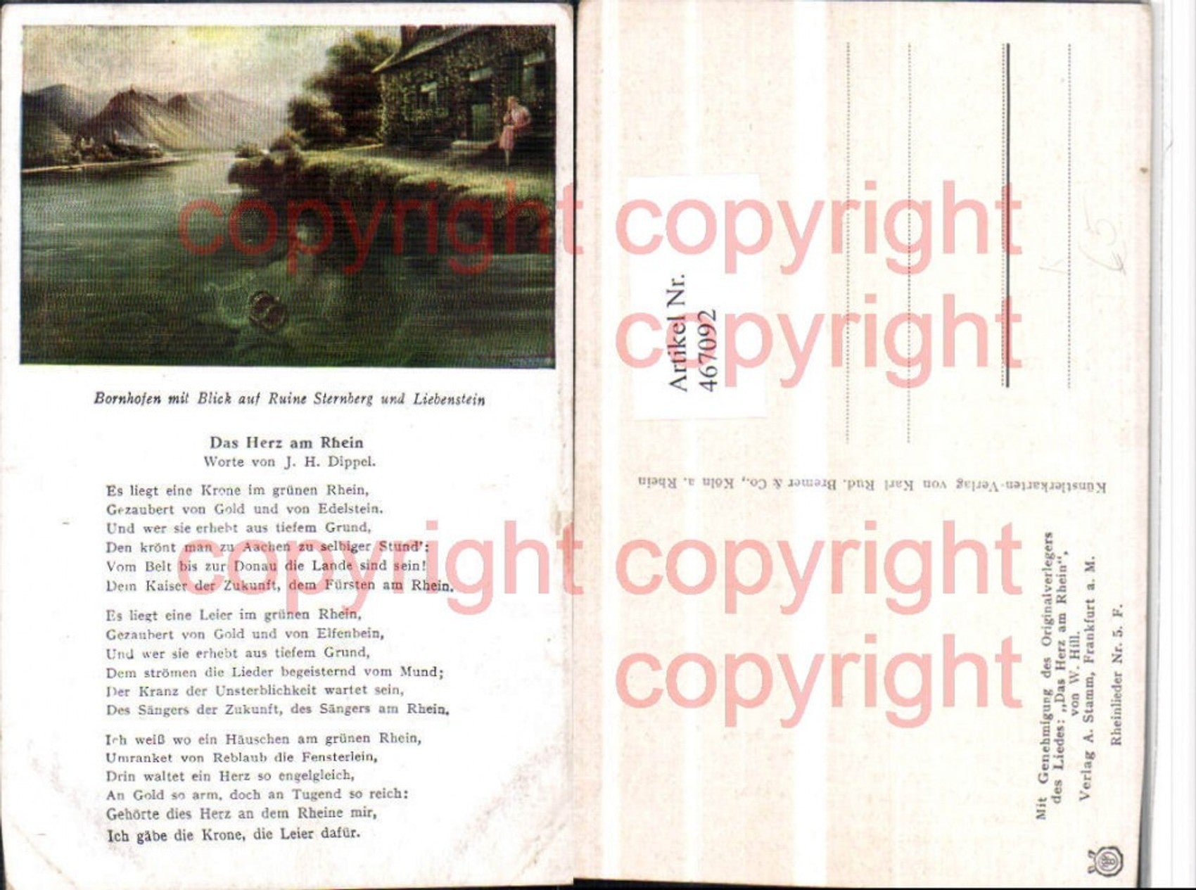 467092,Künstler AK W. Hill Bornhofen m. Ruine Sternberg u. Liebenstein Text