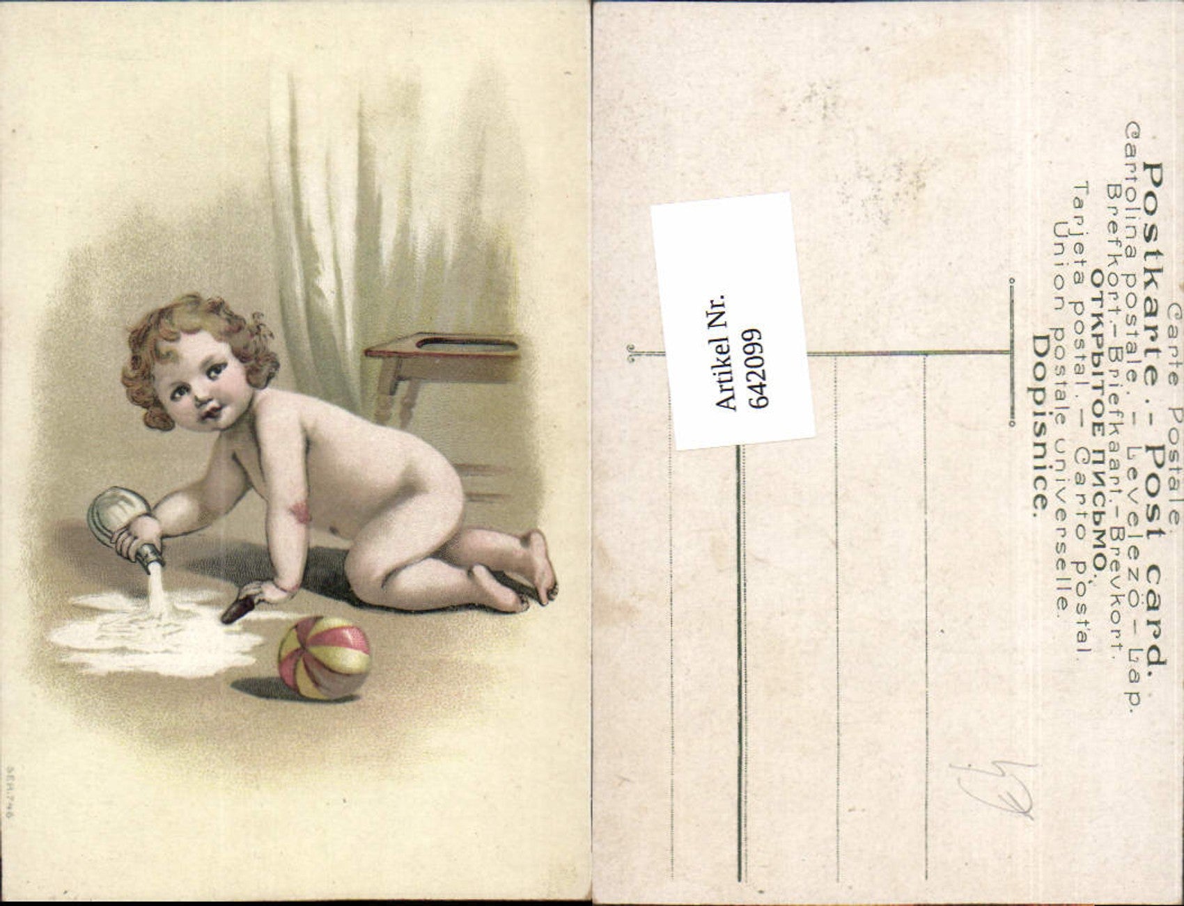 642099,Scherz Humor Kind m. Milch Ball am Boden