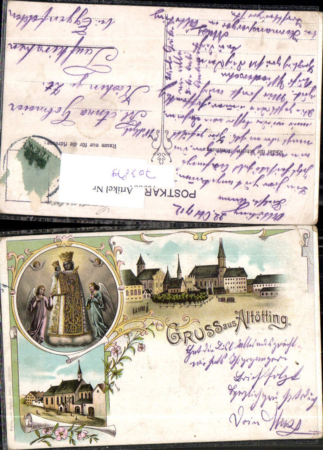 Lithographie Gruss aus Altötting Gnadenmutter gel Taufkirchen Falkenberg Eggenfelden Rottal Inn
