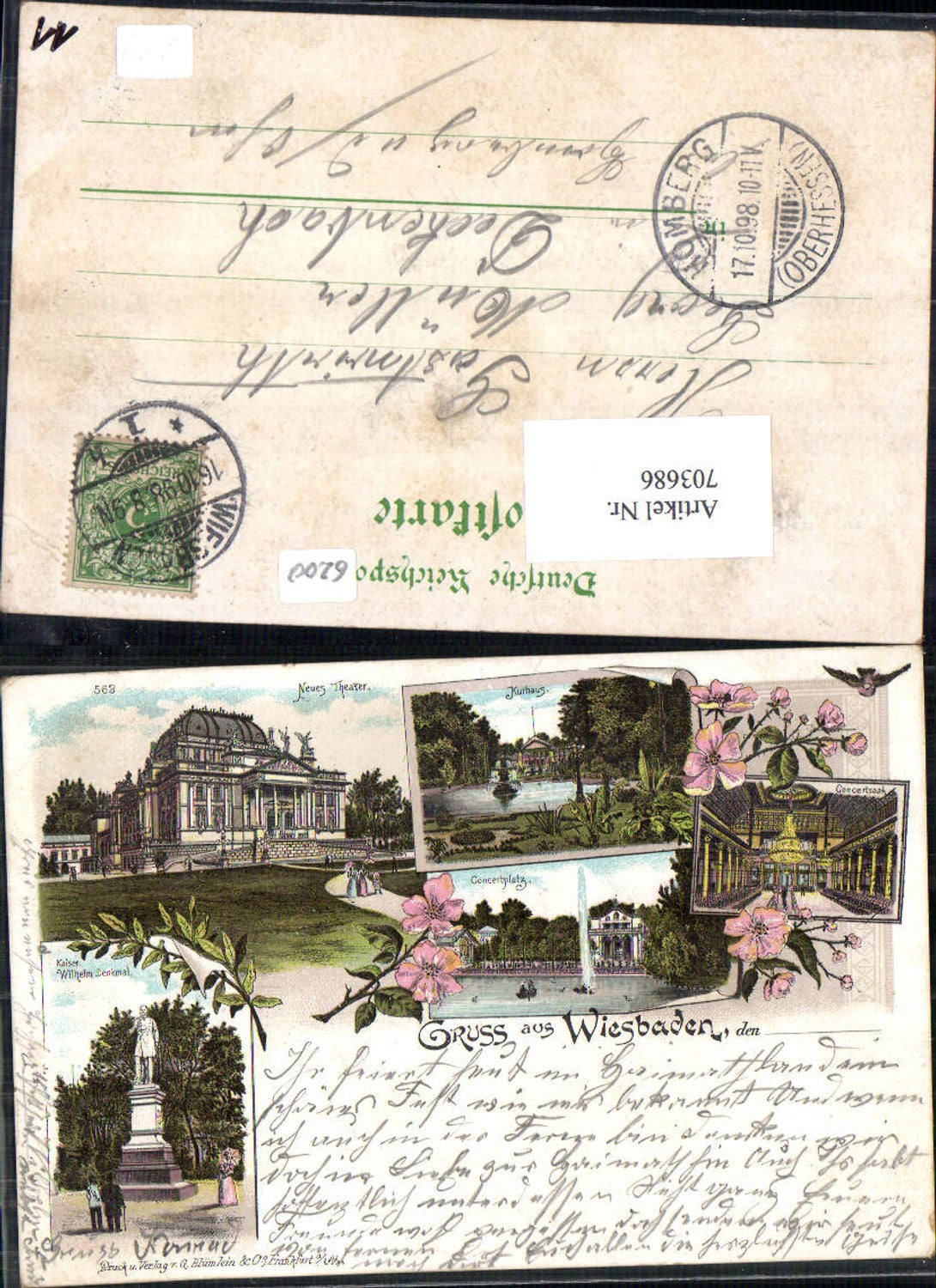 Lithographie Gruss aus Wiesbaden Theater Stp. Homberg Deckenbach