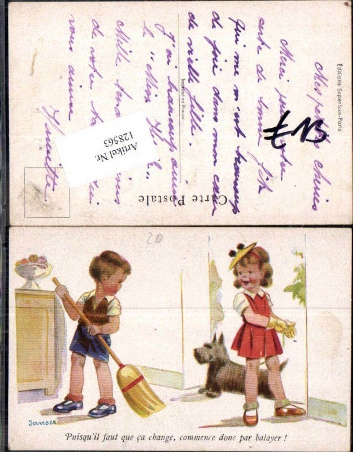 128563,Schöne Künstler AK Kinder Hund Junge beim kehren m. Besen sign. Janser