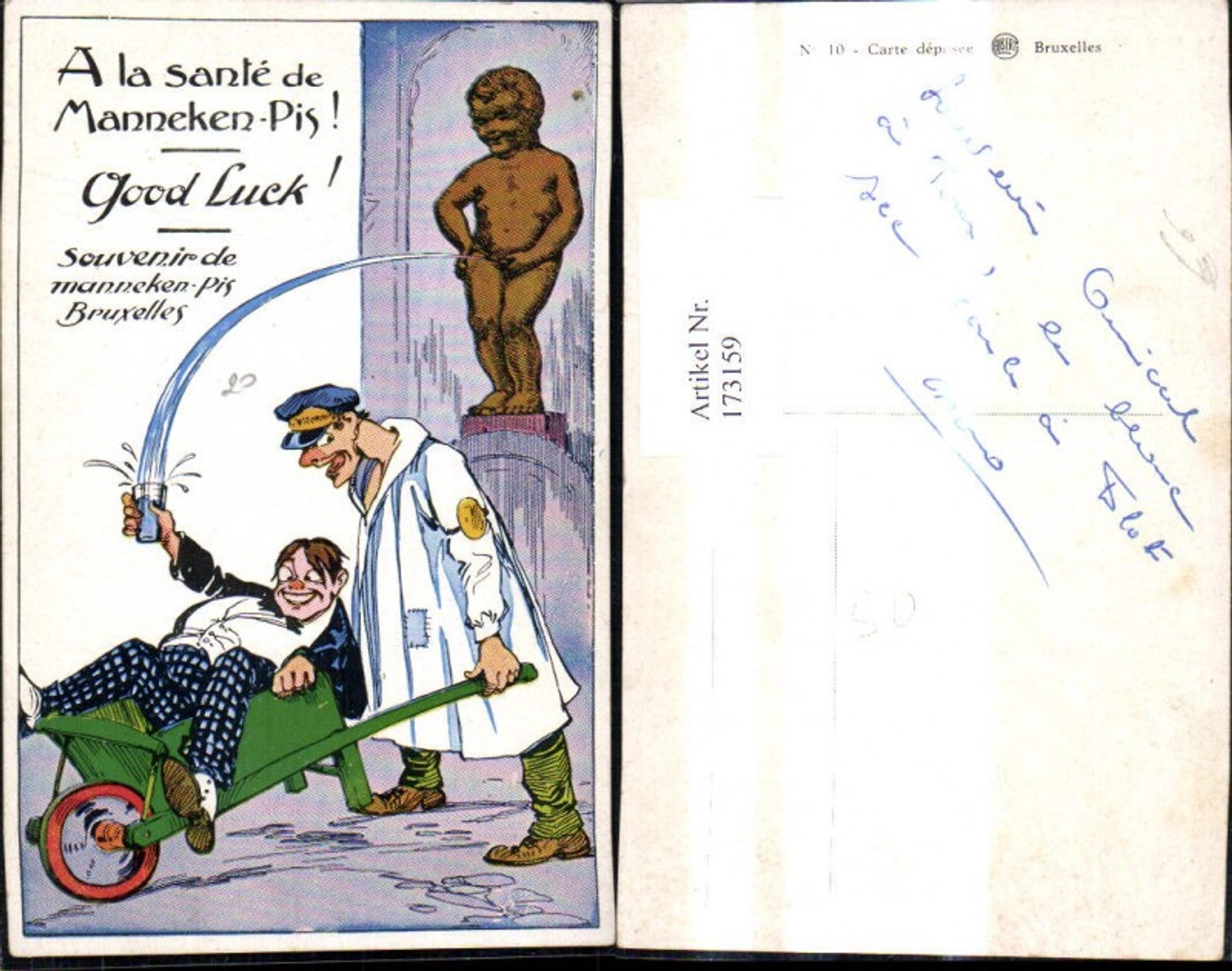173159,Künstler Ak Scherz Humor Betrunkener i. Schubkarre Scheibtruhe m. Glas Mannecken Pis Bruxelles