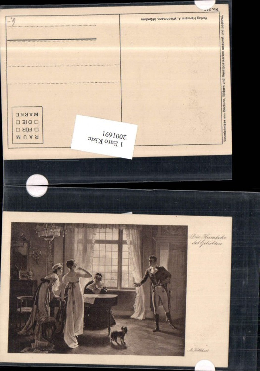 2001691,Künstler AK M. Volkhart „Die Heimkehr des Geliebten“ Frauen b. Klavier Hund