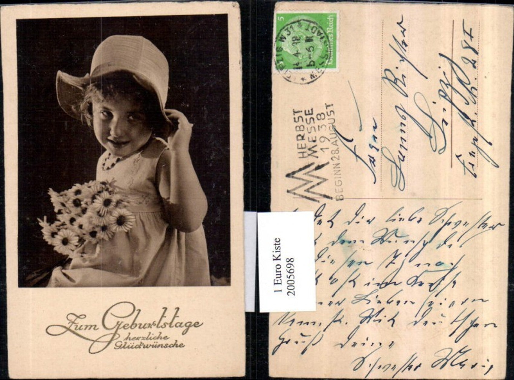 2005698,Geburtstag Mädchen m. Hut u. Blumenstrauß Margeriten Portrait