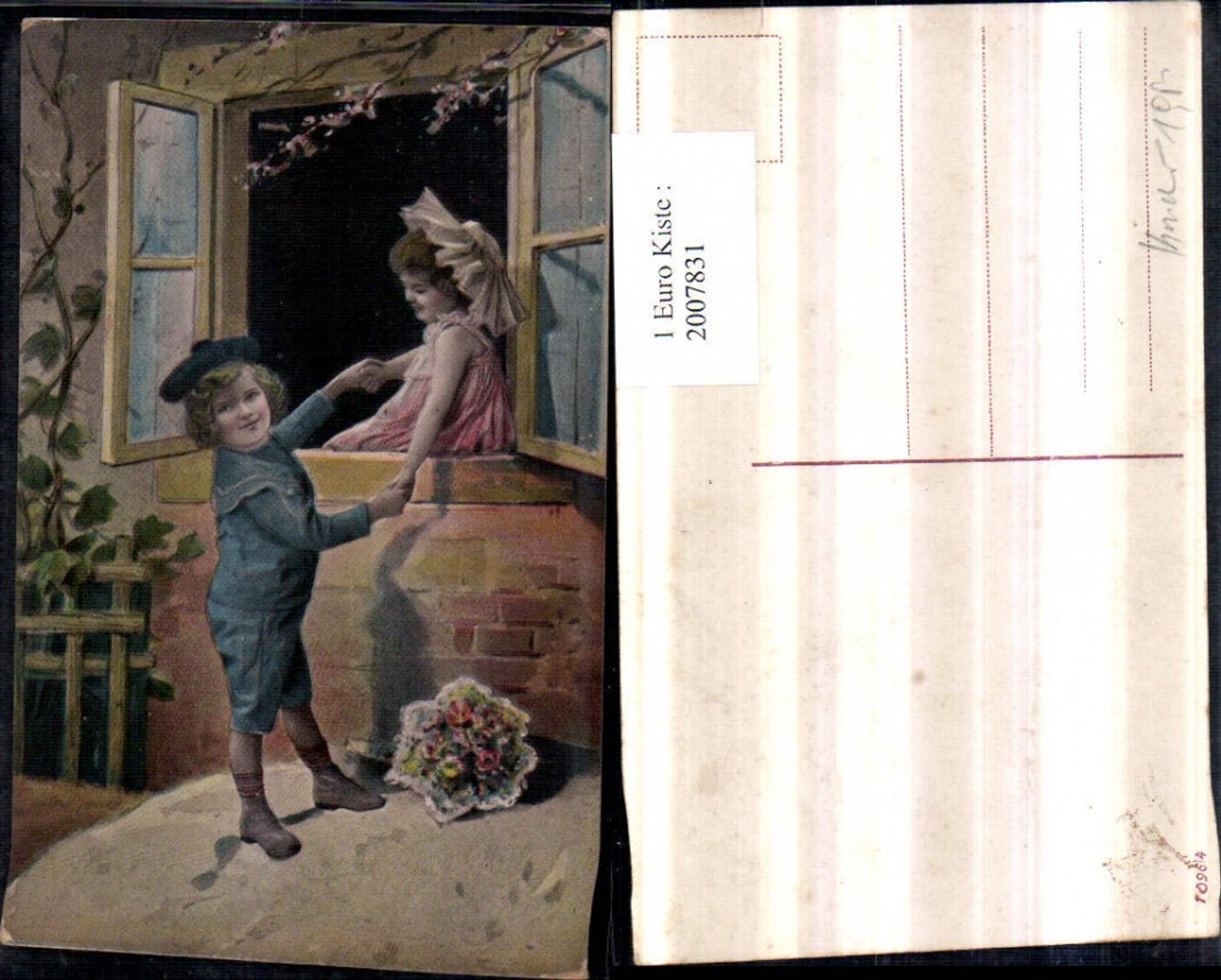 2007831,Künstler AK Junge Bub m. Matrosenanzug Mädchen Händchen haltend Fenster Blumenstrauß