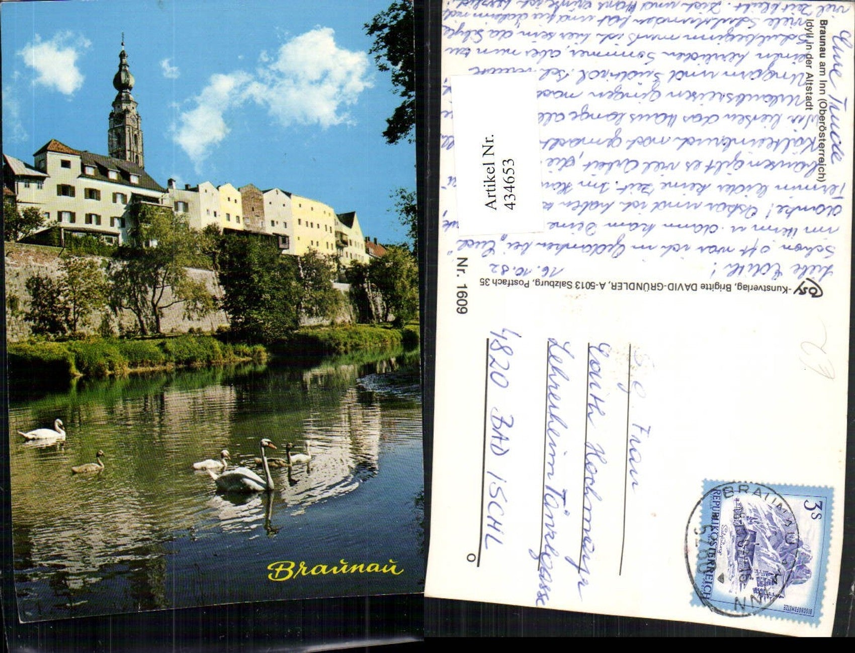 434653,Braunau am Inn Teilansicht Kirchenturm Fluss Schwäne