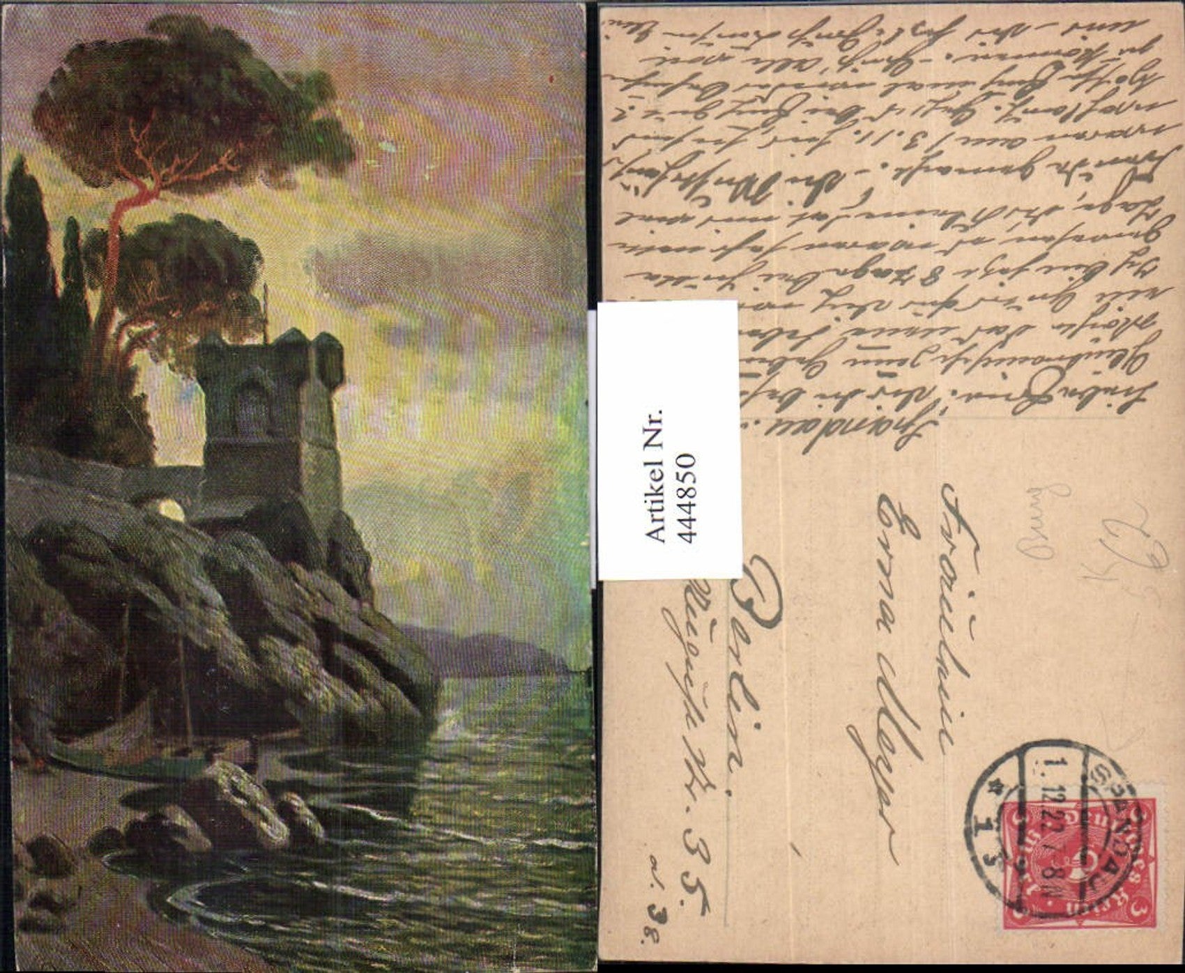 444850,Künstler Ak Burg auf Felsen Segelboot Ufer