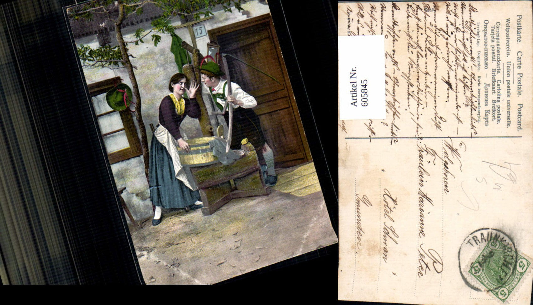 605845,Stempel Traunkirchen Paar Tracht v. Bauernhaus Sense Landwirtschaft