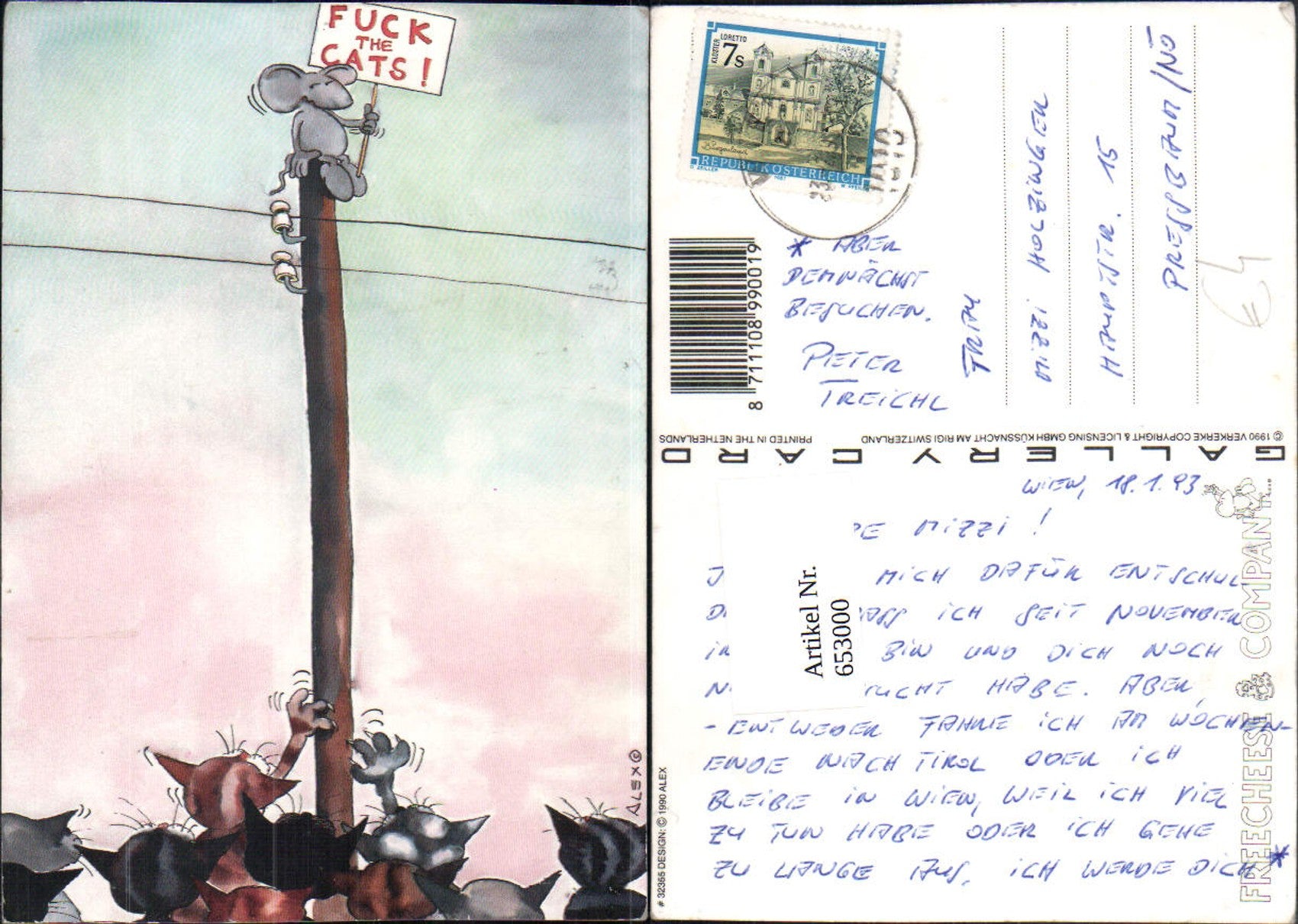 653000,Künstler Ak Alex Fuck the Cats Maus auf Stromleitung Humor