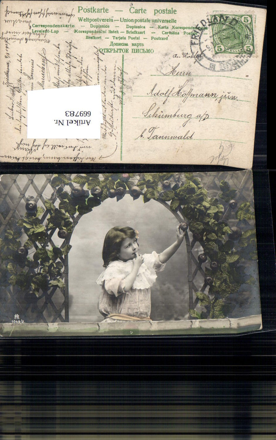 669783,Mädchen Kind Lockenkopf Kleid mit Rankgitter Apfel Pflanze
