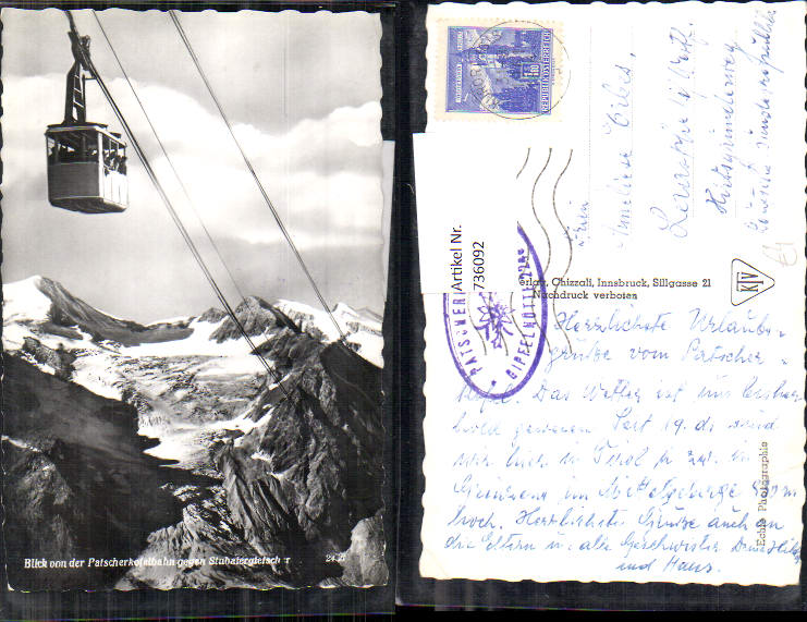 736092 Foto AK Patsch Innsbruck Blick v. d. Patscherkofelbahn geg. Stubaiergletscher Seilbahn Gondel