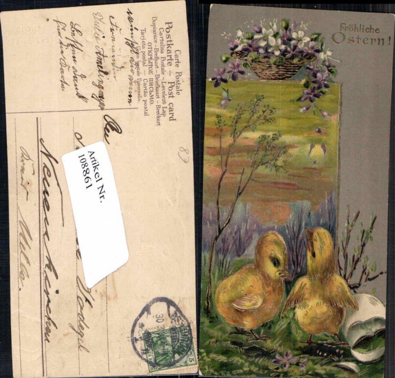 108861,Tolle Präge AK Ostern Küken Blumen verziert Golddruck