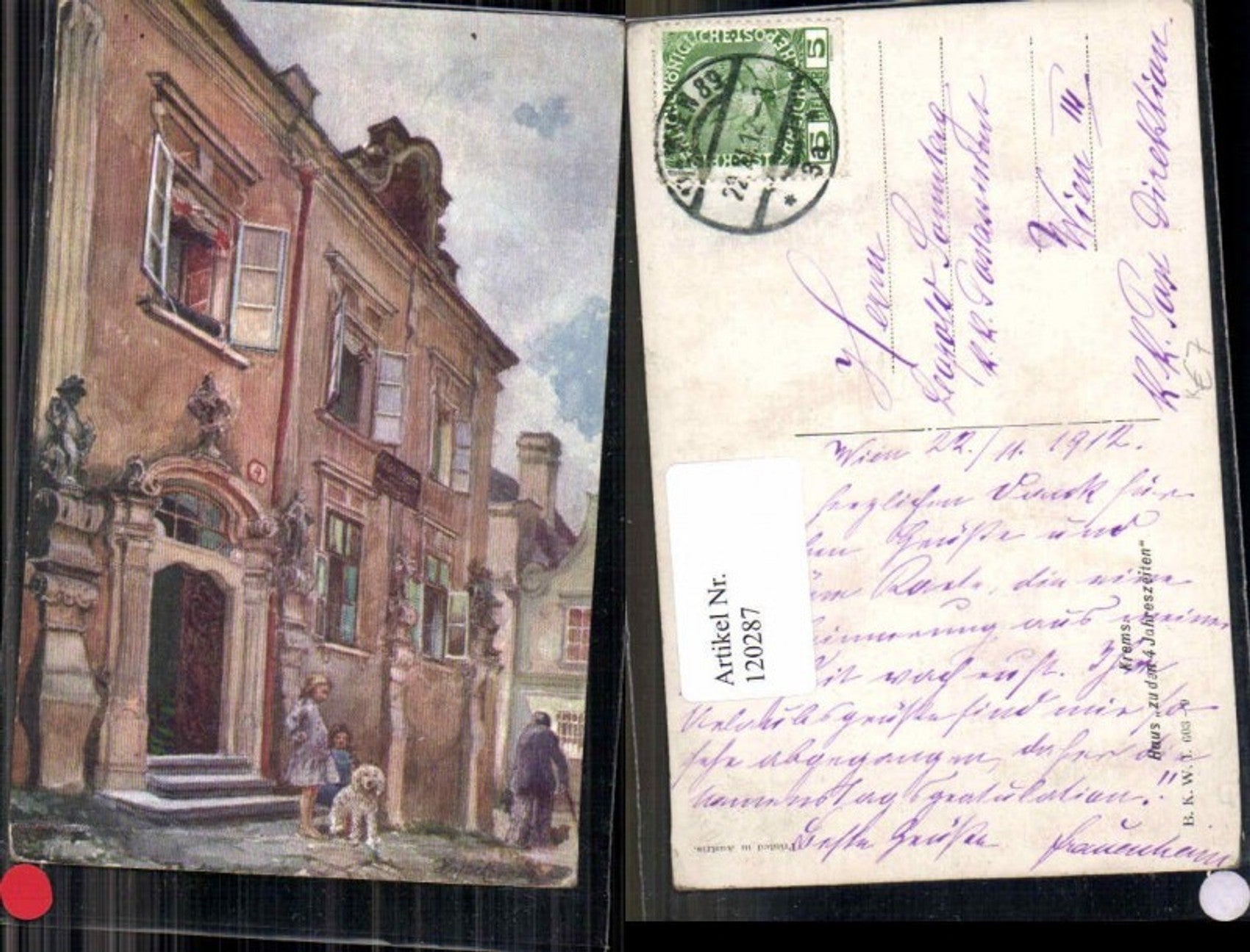 120287,Krems a.d. Donau Haus z. 4 Jahreszeiten E.F. Hofecker sign. Hund Kinder Pudel