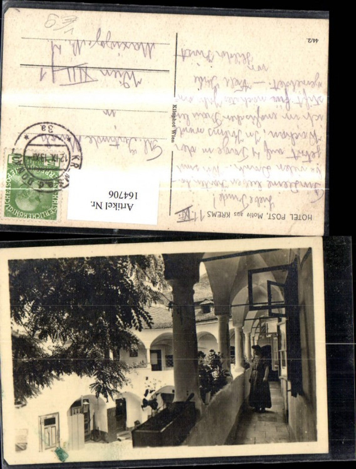 164706,Krems Ansicht Hotel Post Torbögen Arkadenhof Innenhof m. Frau 1912 pub Kilophot