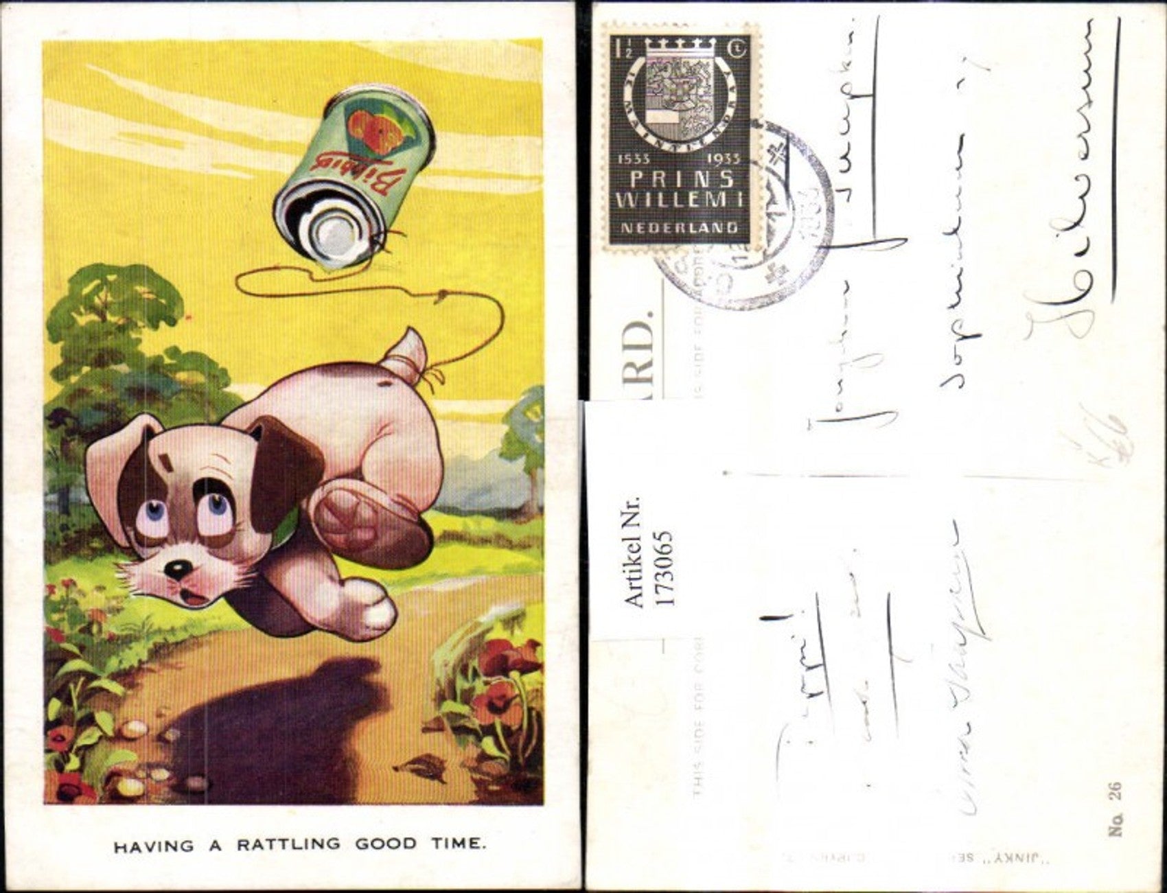 173065,Künstler Ak Scherz Humor Hund zieht Blechdose Dose hinterher Having a Rattling Good Time pub Jinke 26