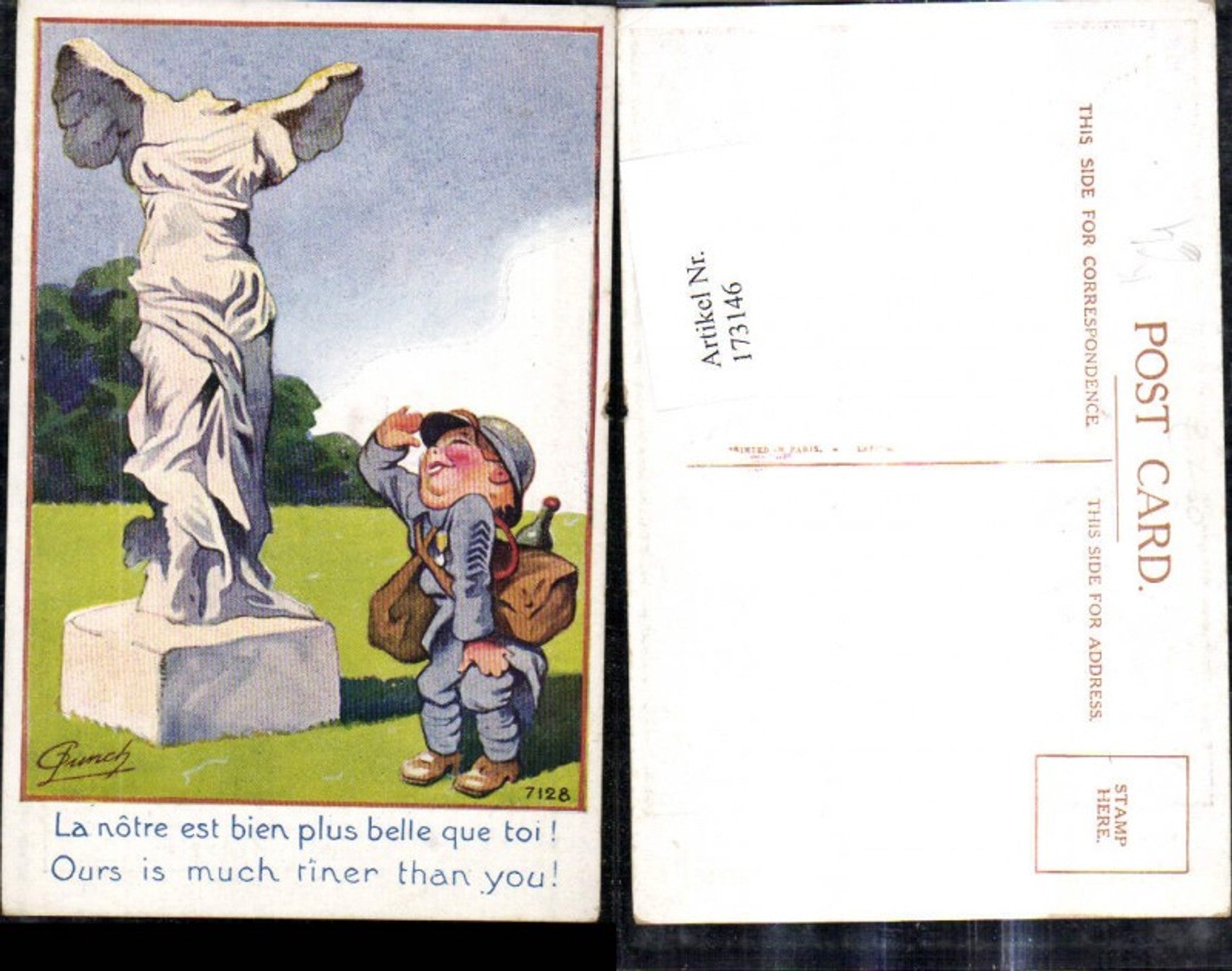 173146,Künstler Ak G. Lunch Scherz Humor Bub Kindersoldat salutiert v. kopfloser Statue Spruch