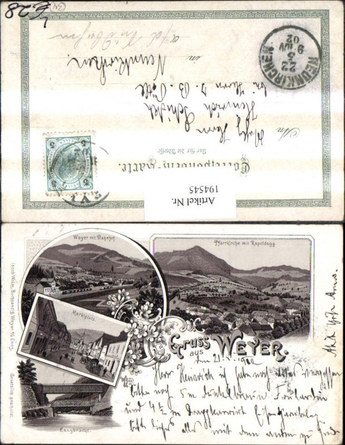 194545,Litho AK Gruß aus Weyer Bahnhof Pfarrkirche m. Rapoldegg Marktplatz Ennsbrücke Mehrbildkarte