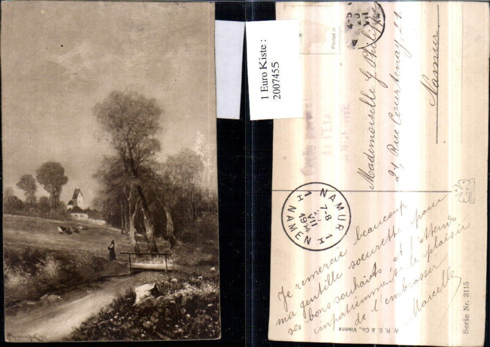2007455,Künstler AK Landschaft Bach Brücke Dorf Hühner