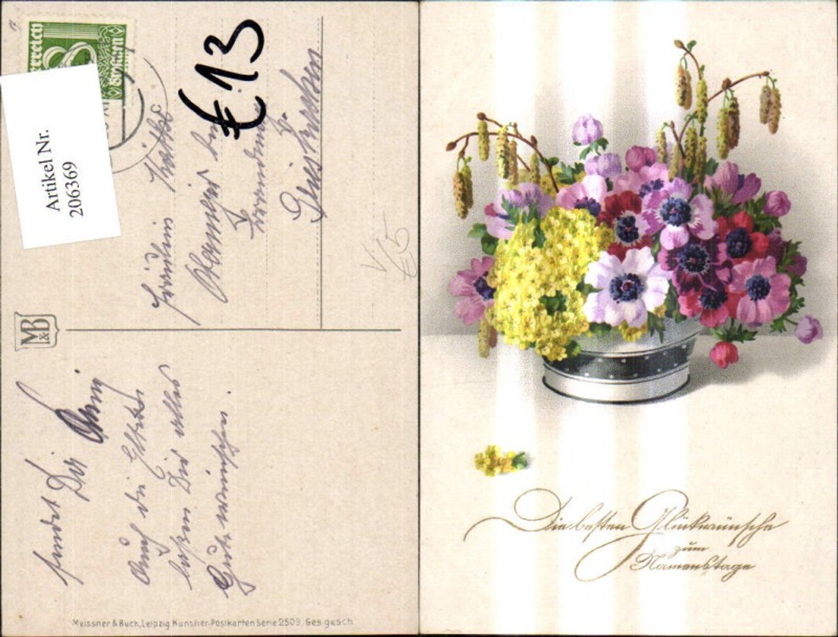 206369,Künstler Ak Meissner & Buch 2509 Blumen Zweige i. Vase Topf Namestag