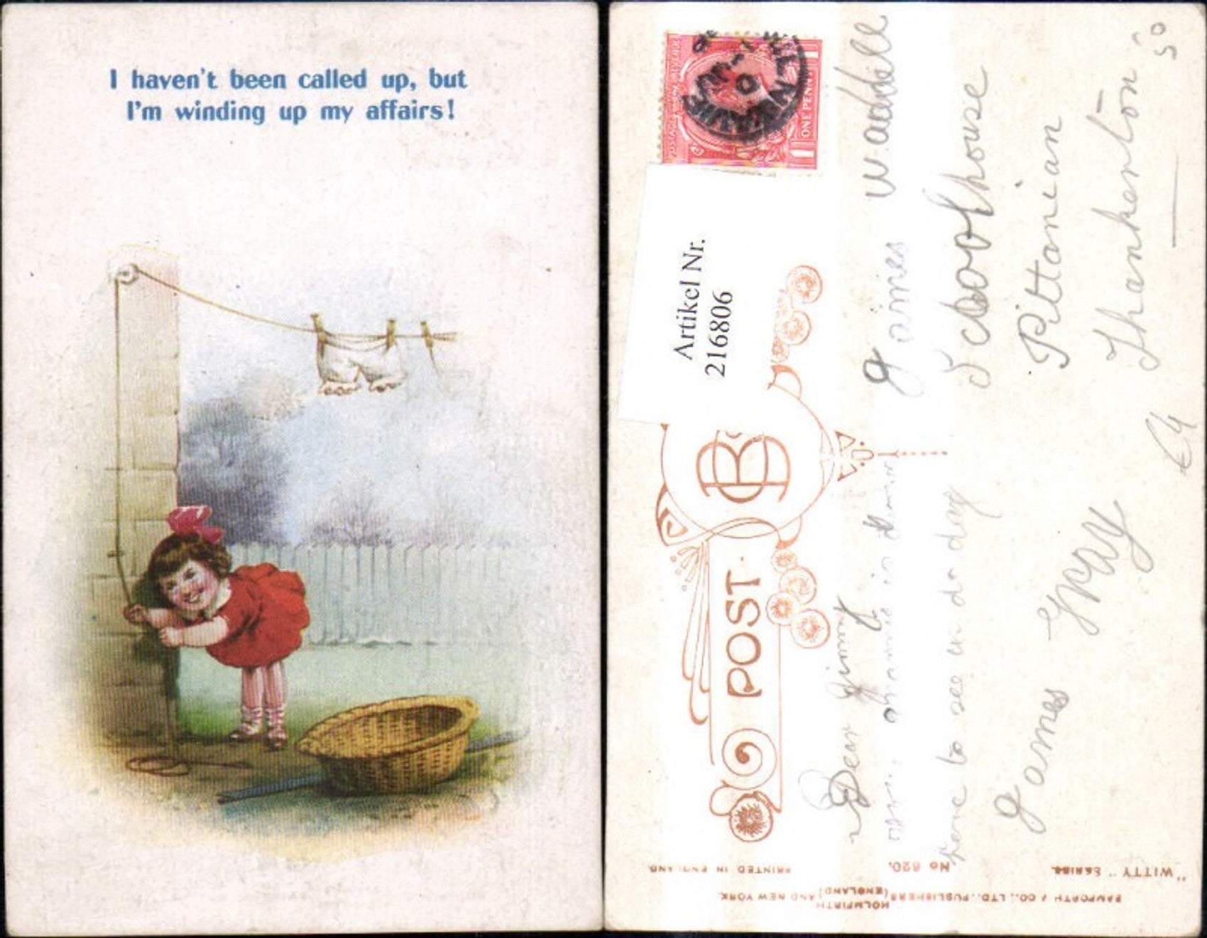216806,Künstler Ak Mädchen zieht a. Wäscheleine I havent been called up, but Im winding up my affairs Scherz Humor
