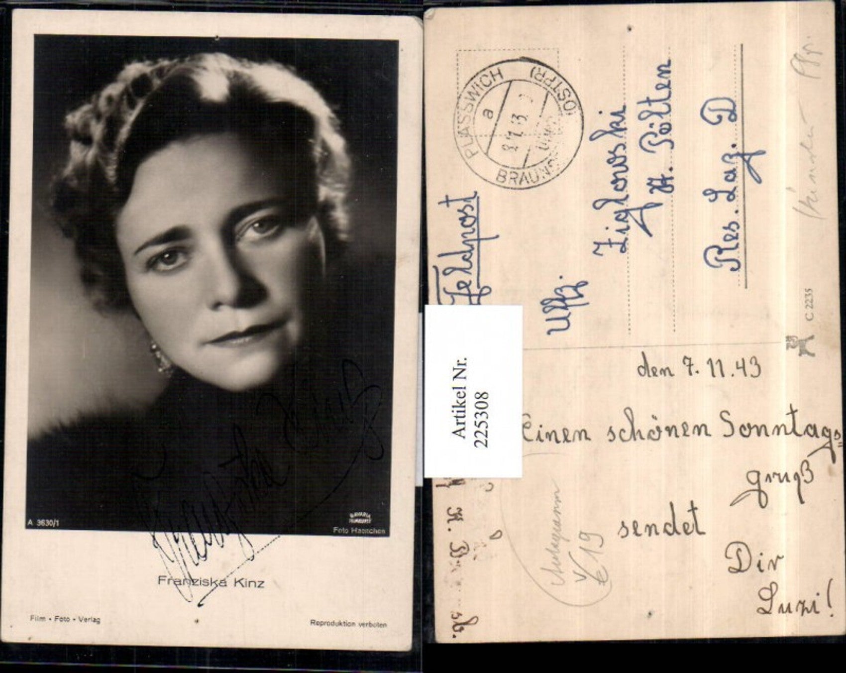 225308,Schauspielerin Franziska Kinz Portrait m. Autogramm pub Foto Haenchen A 3630/1