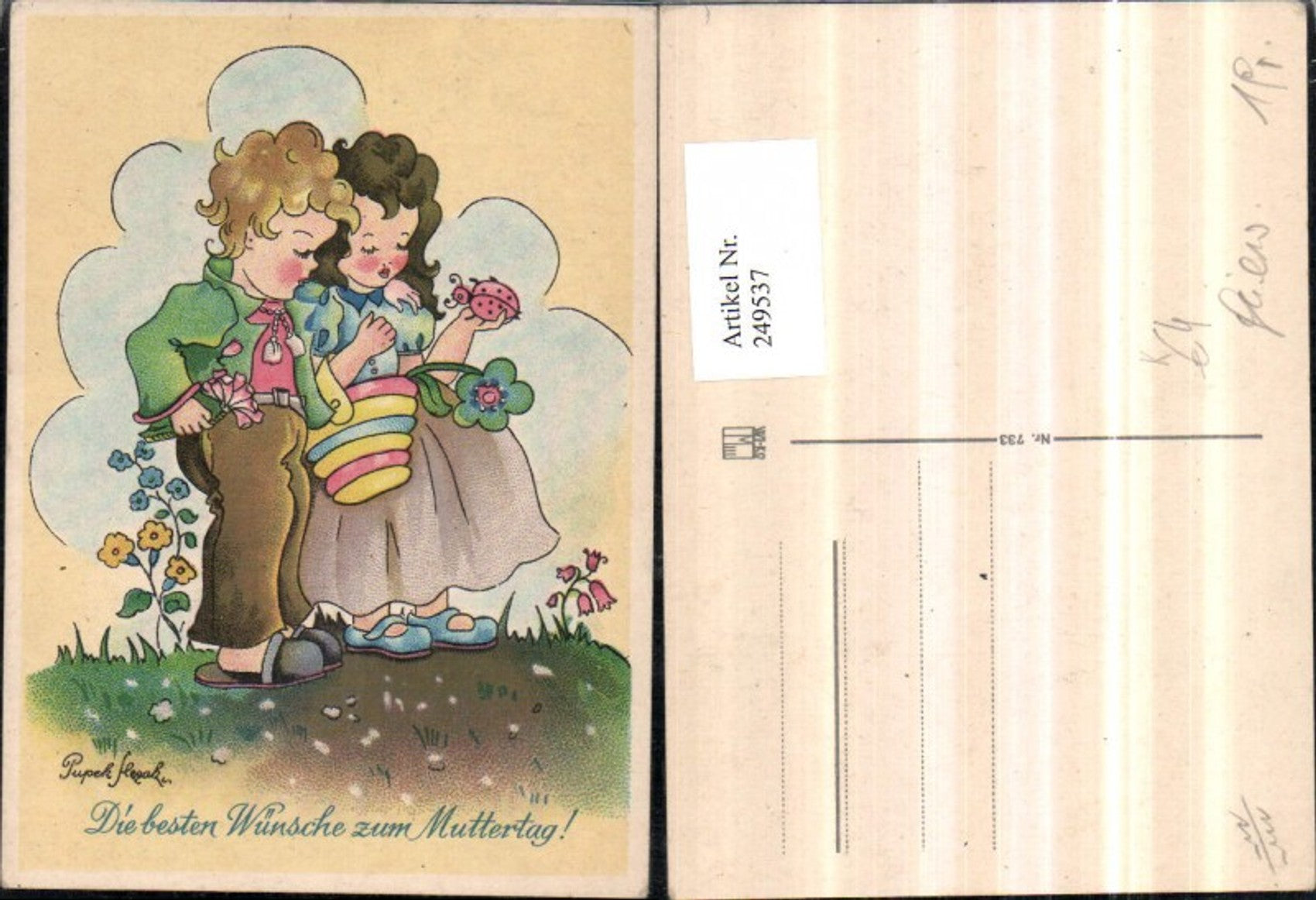 249537,Künstler AK Pupek Muttertag Kinder Mädchen m. Korb Marienkäfer Blume Pantoffeln