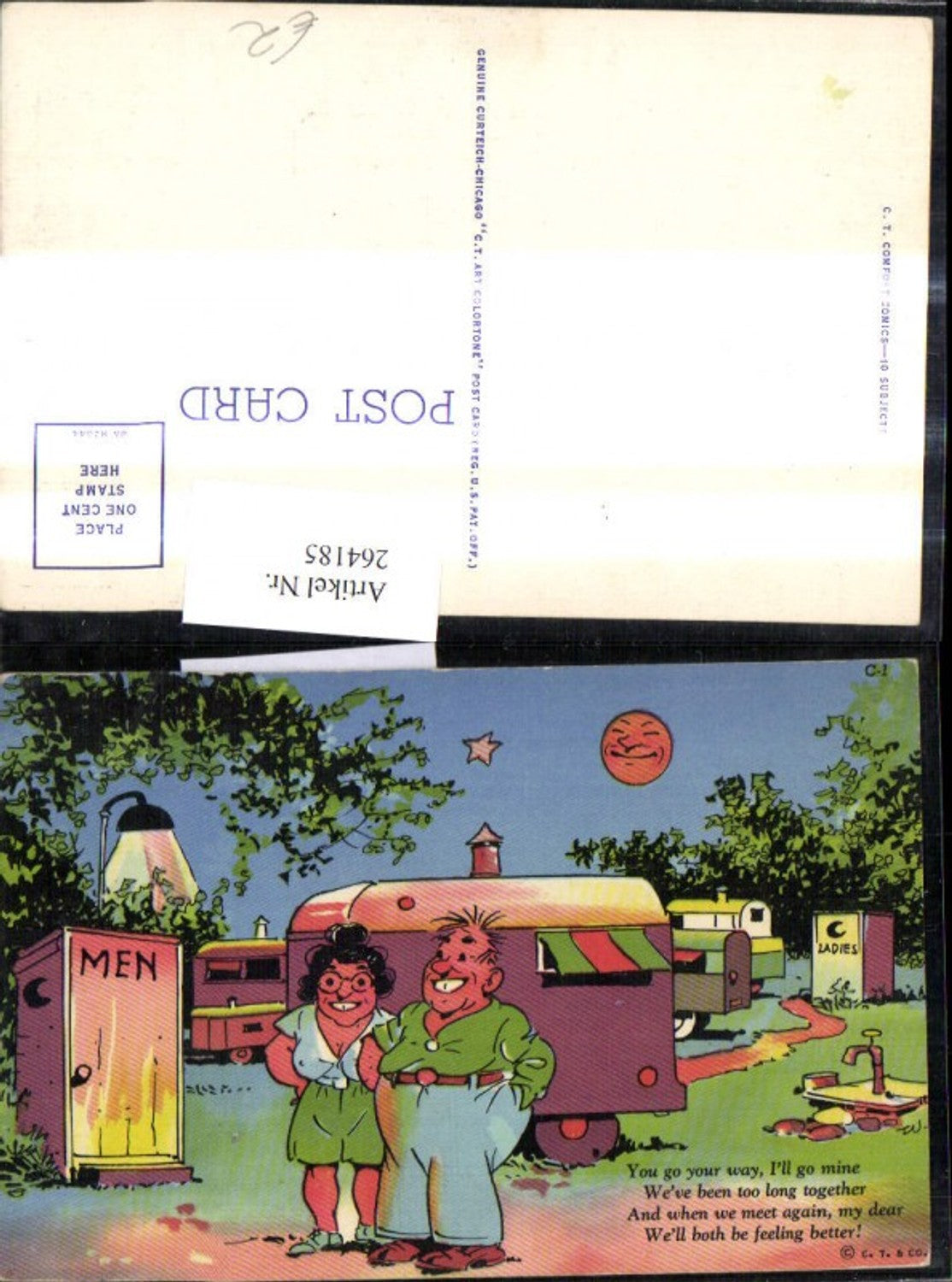 264185,Künstler Ak Paar b. Campingklo Mondgesicht Scherz Humor