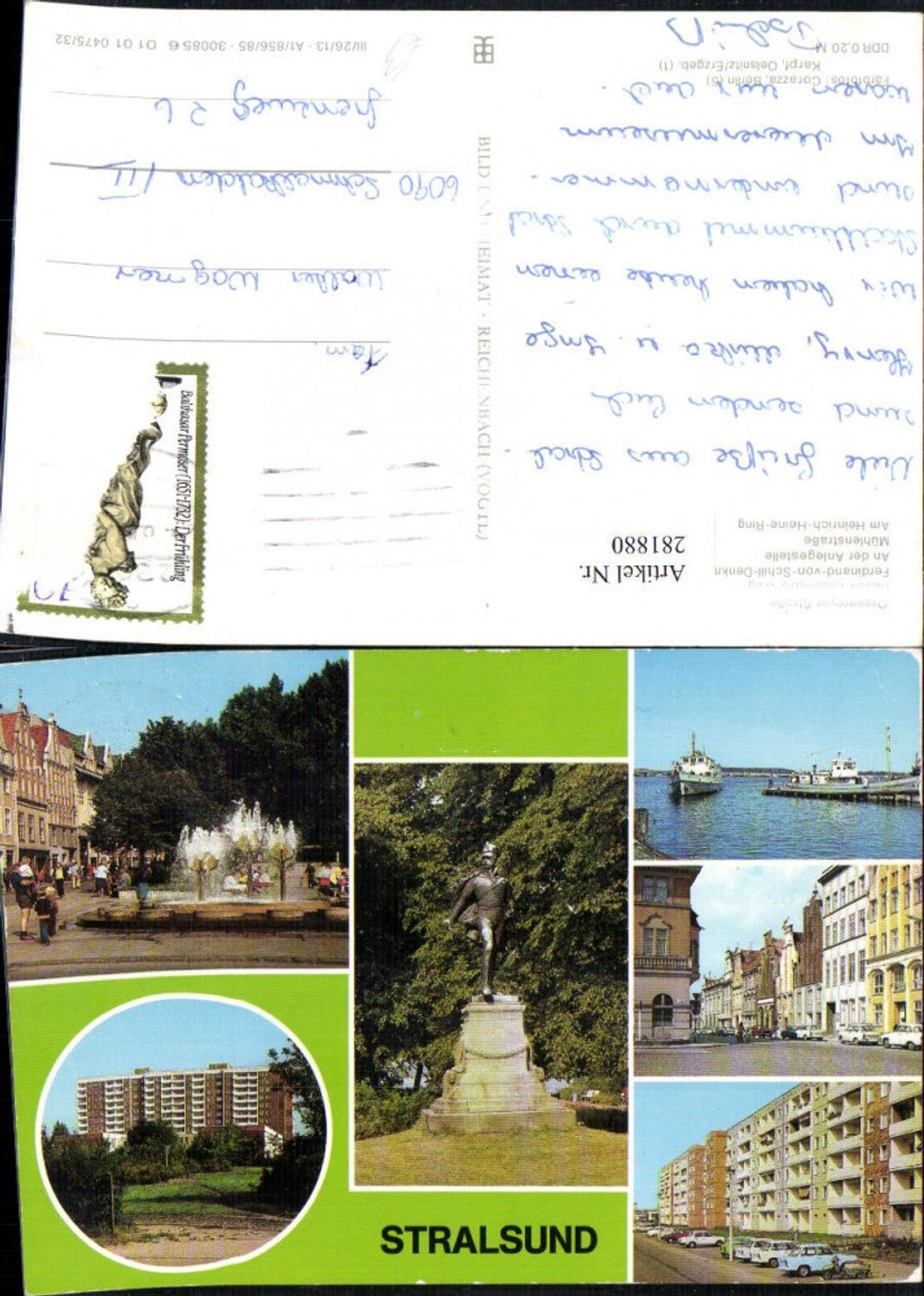 281880,Stralsund Ferdinand-von-Schill-Denkmal Anlegestelle Schiff Brunnen Mehrbildkarte