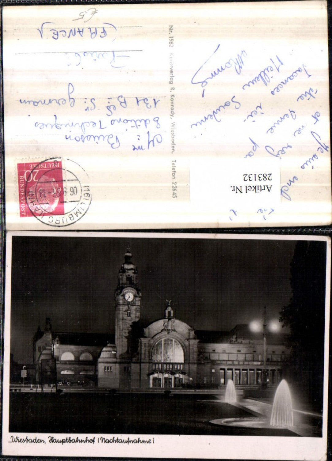 283132,Wiesbaden Hauptbahnhof Bahnhof b. Nacht Beleuchtung Springbrunnen