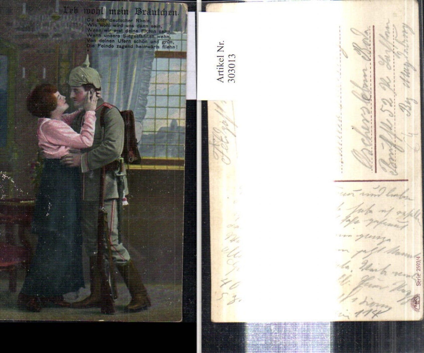 303013,WW1 Soldat Pickelhaube Frau Umarmung Spruch Leb wohl mein Bräutchen Patriotik Propaganda